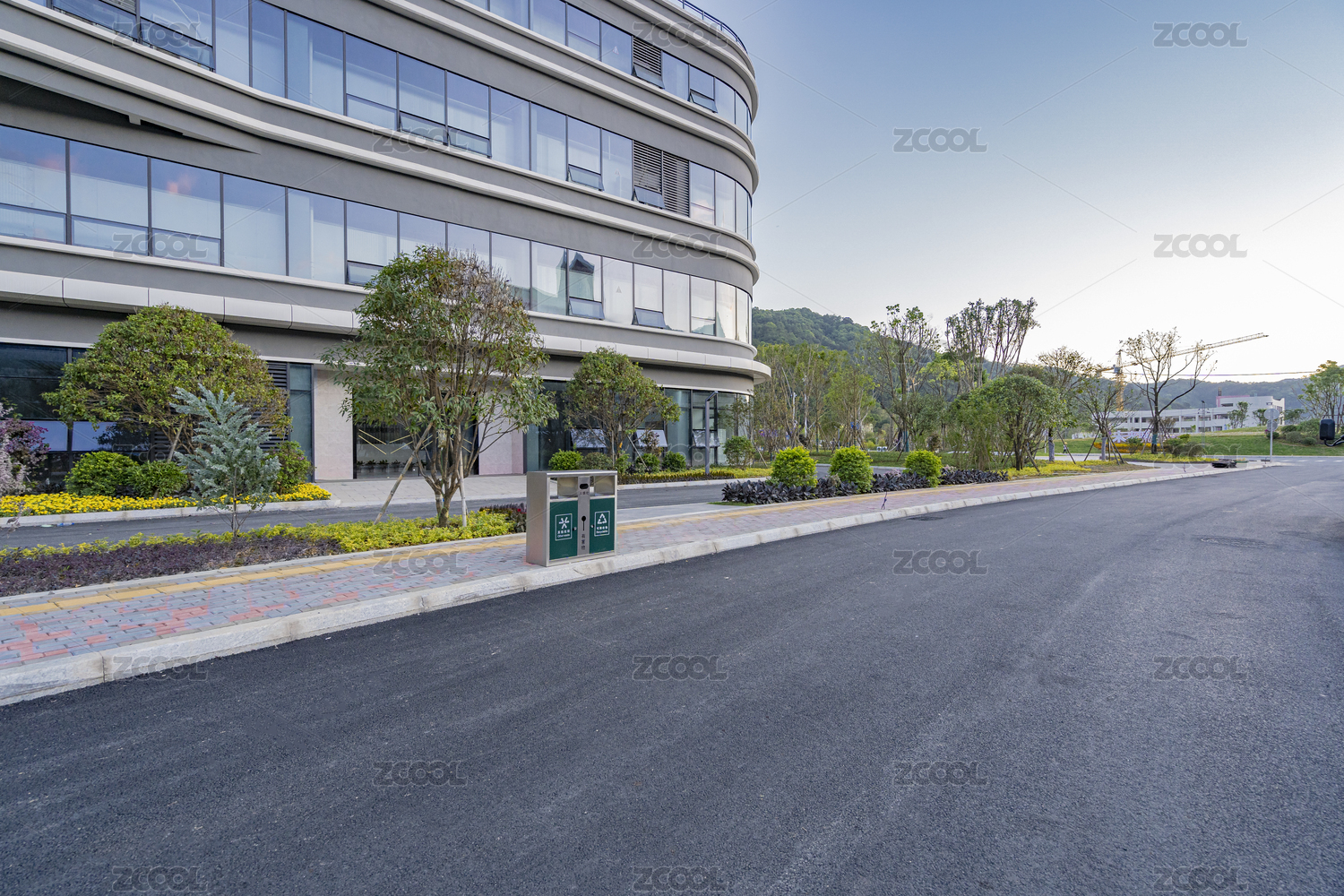 一幢帶幾何造型的玻璃幕墻建筑及柏油路