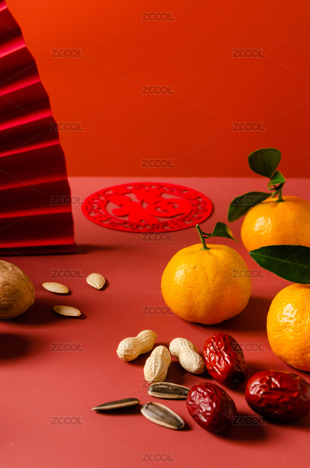 各種年貨零食水果擺放在紅色背景里