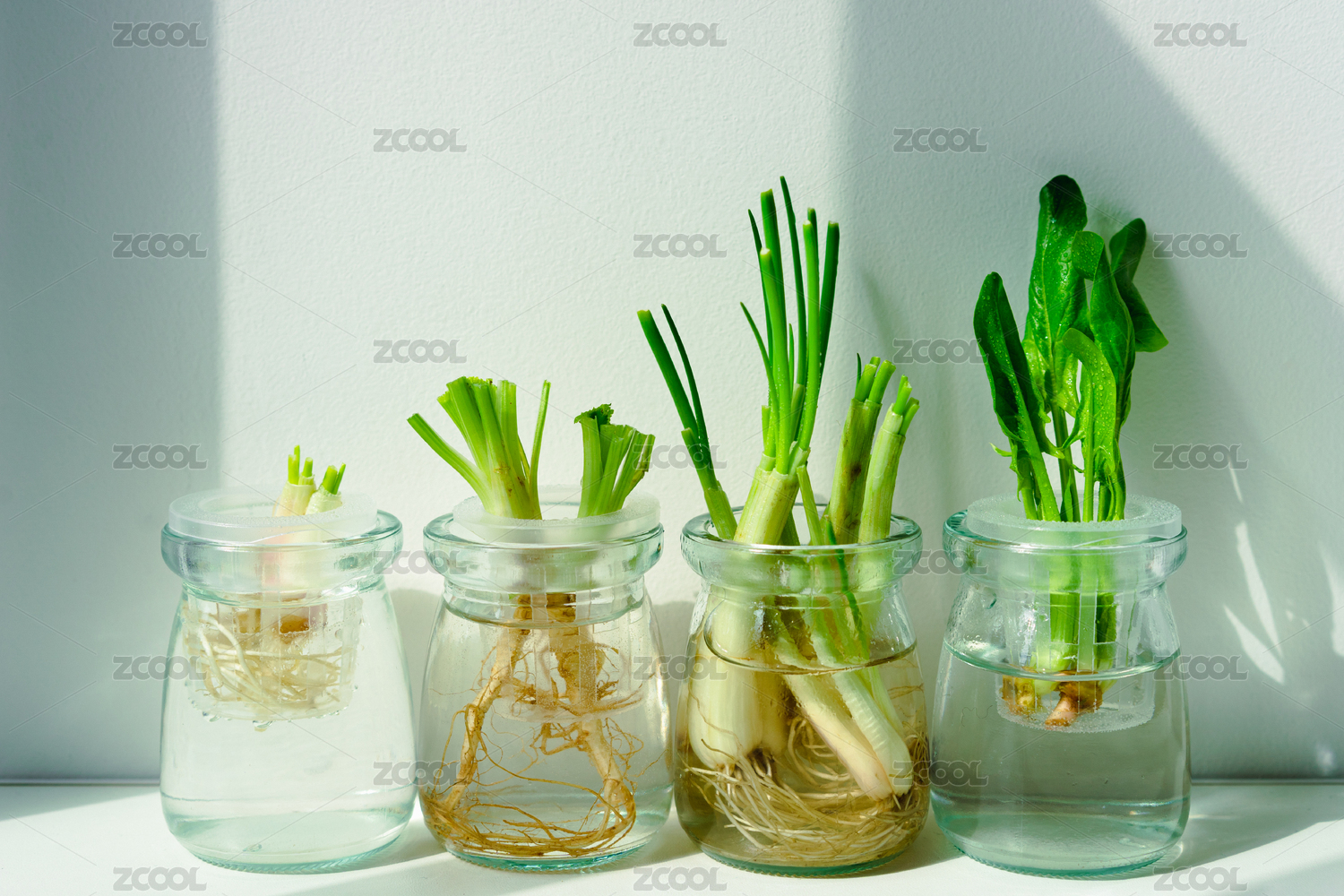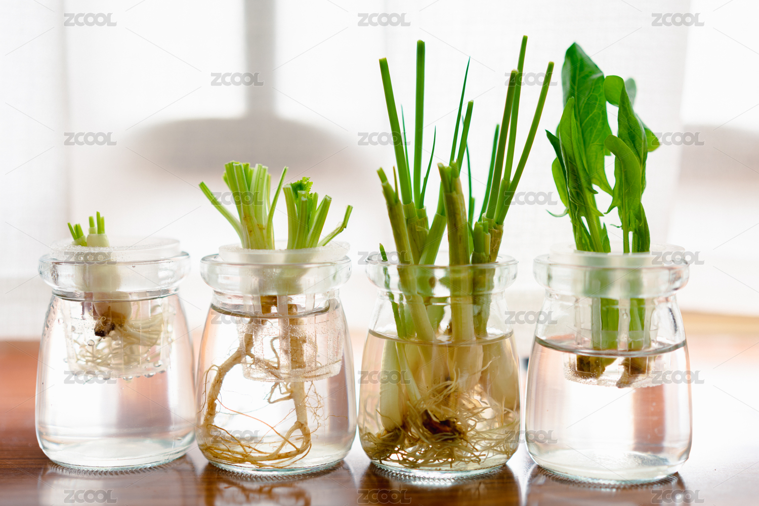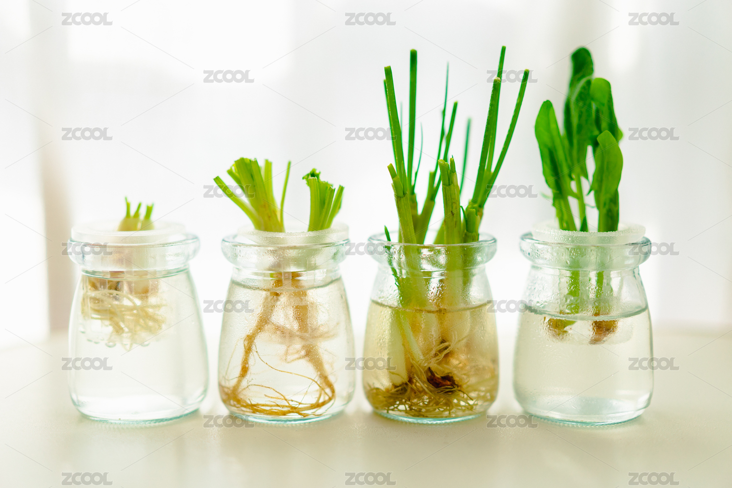 在家用玻璃瓶水培蔬菜小蔥菠菜和香菜