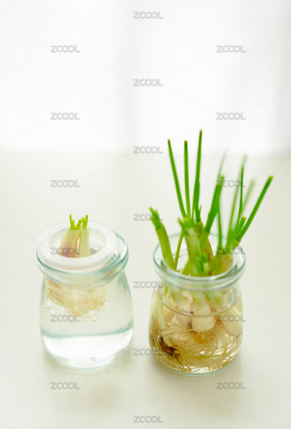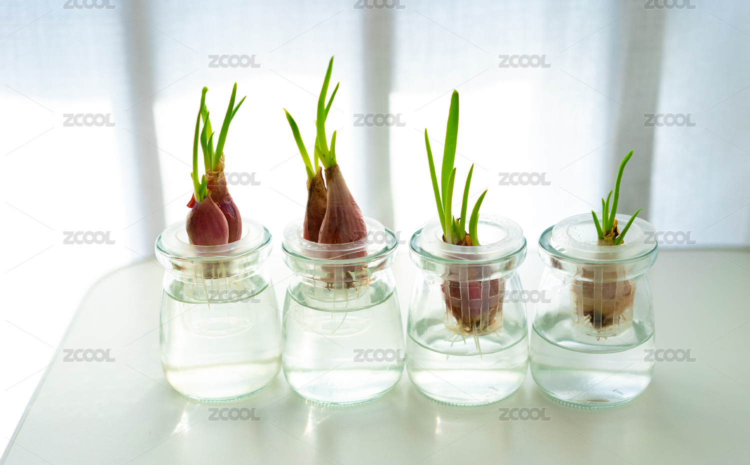 窗邊木地板上放著幾個玻璃瓶水培蔬菜幼苗