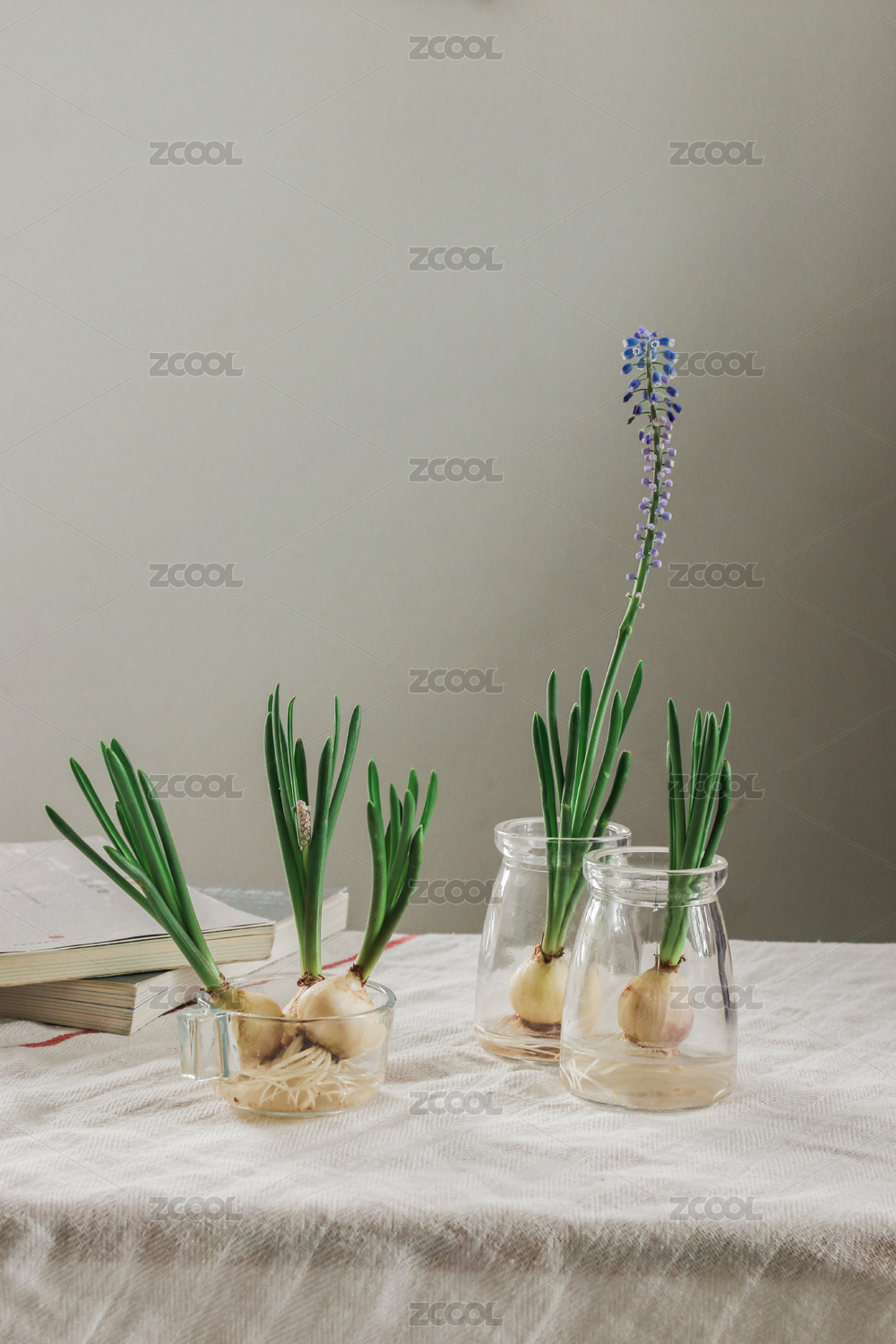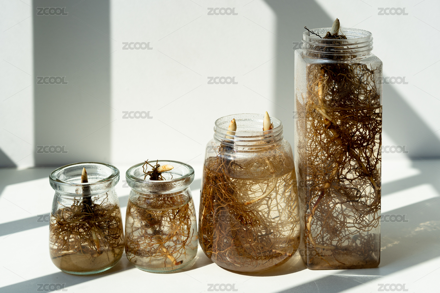 透明瓶子水培植物花卉鈴蘭的根系特寫