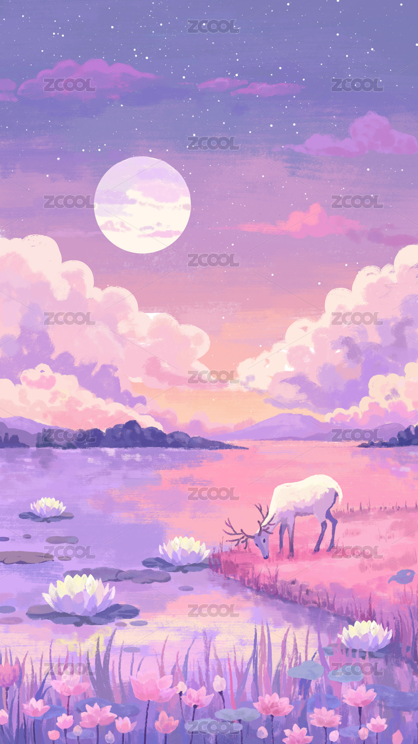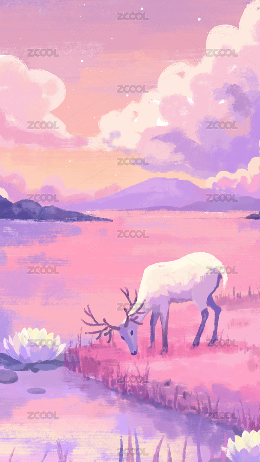 紫色星空下,小鹿在蓮花池邊喝水