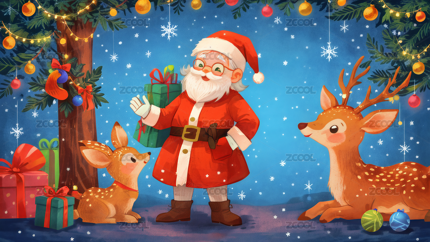 圣誕老人與小鹿插畫
