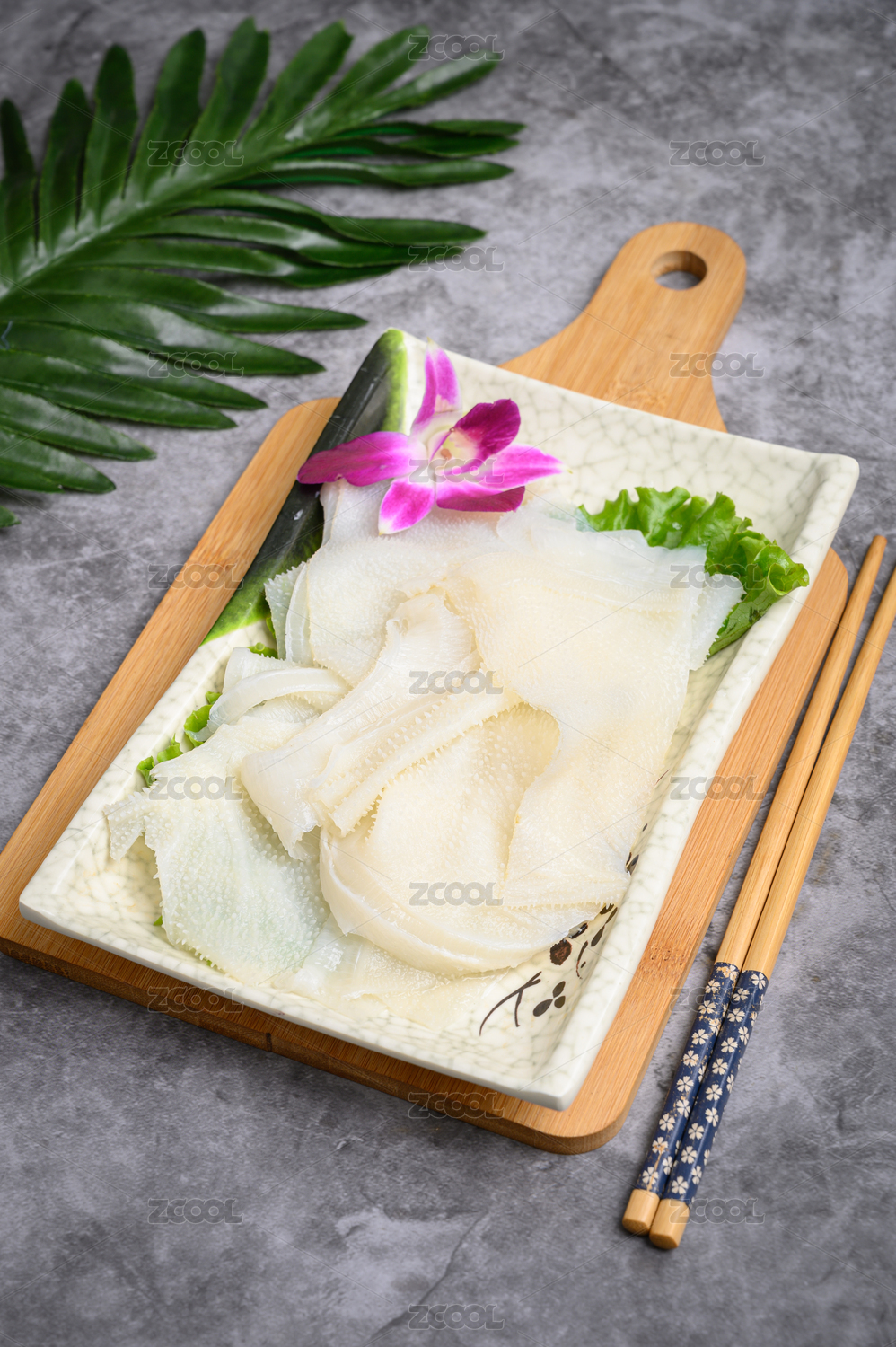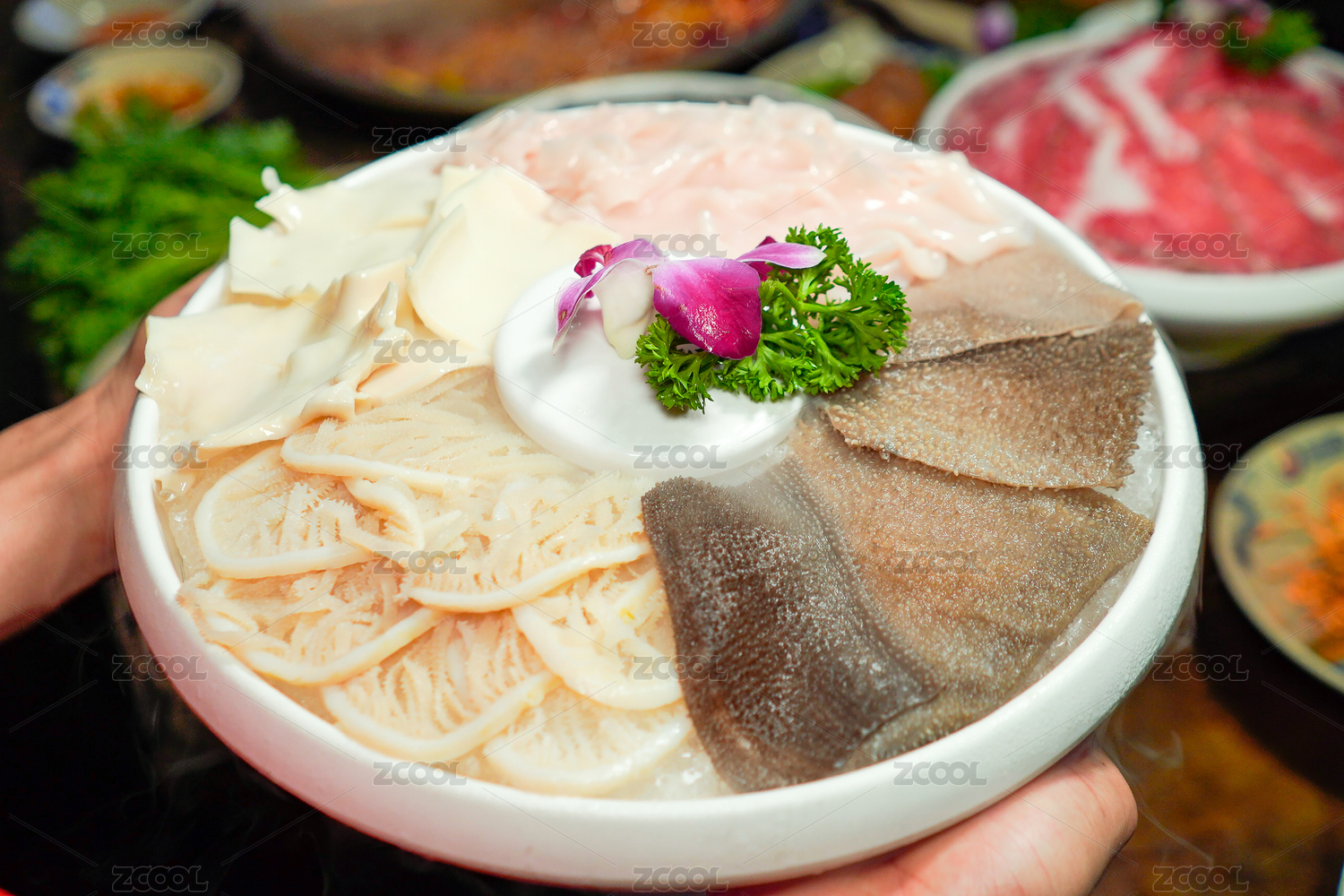 一盤(pán)火鍋千層毛肚放在木質(zhì)桌面上