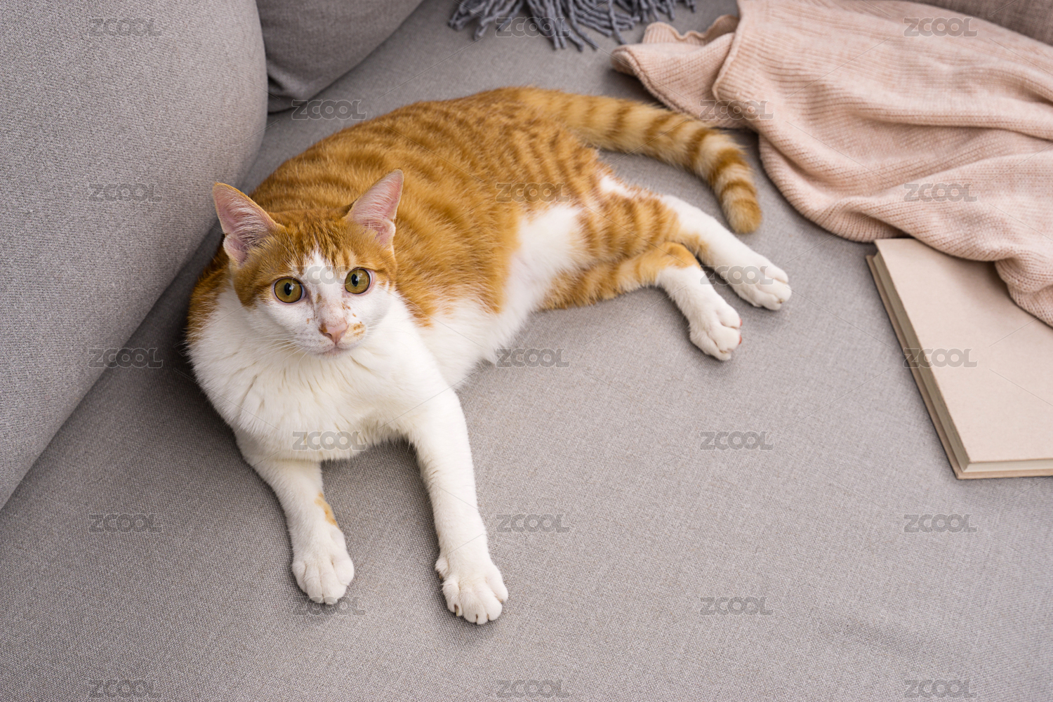 臥在灰色雙人沙發(fā)上注視鏡頭的橘貓