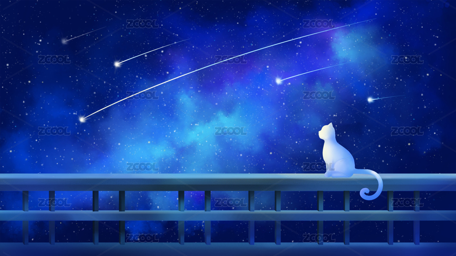 蹲在欄桿上的貓注視著劃過(guò)夜晚星空的流星