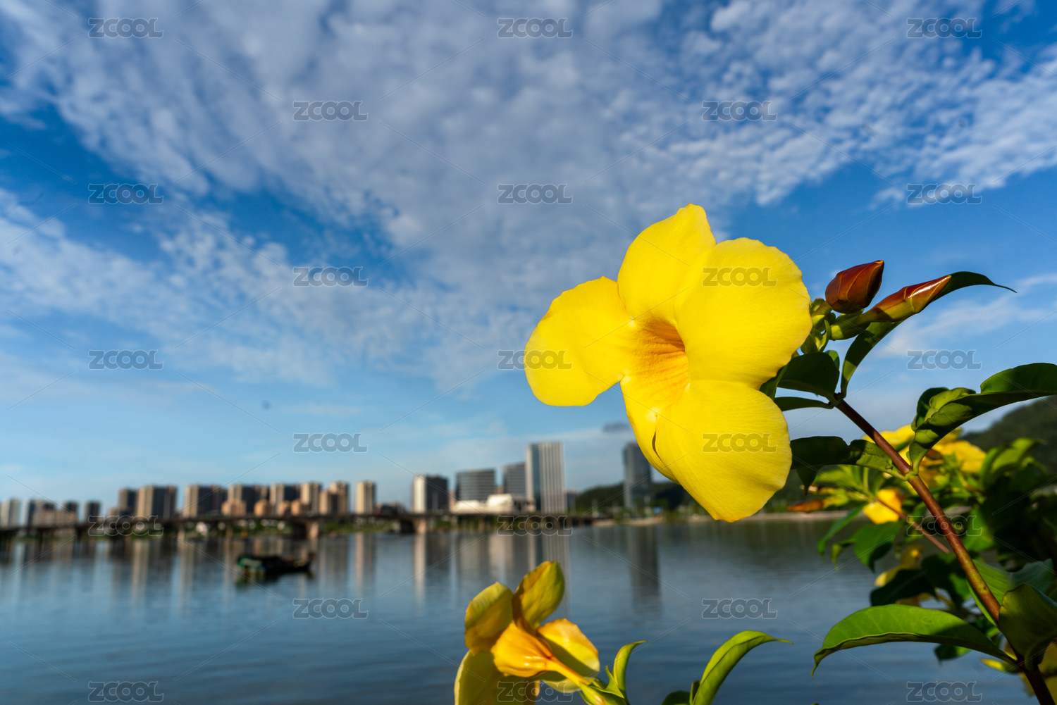 藍(lán)天碧水映襯下的小黃花和城市天際線