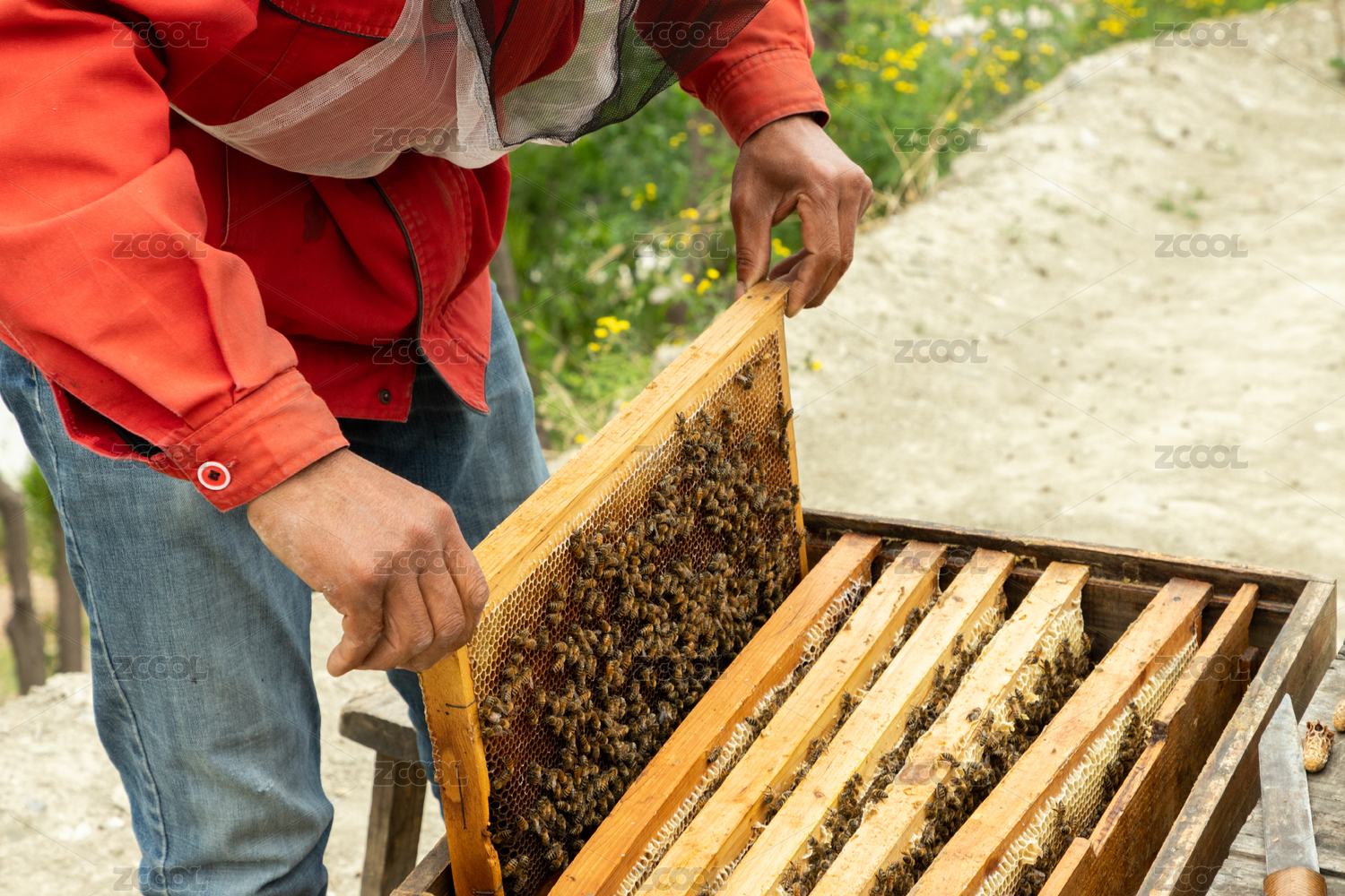 養(yǎng)蜂人和蜜蜂。 養(yǎng)蜂人拿起蜂窩里的充滿蜜蜂的木板,收獲蜂蜜