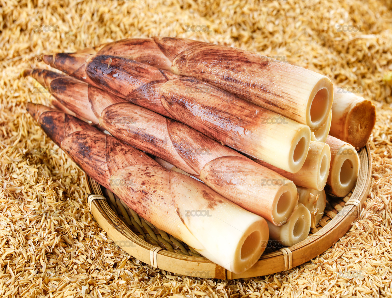 一簸箕雷筍上放著三根剝了皮的雷筍