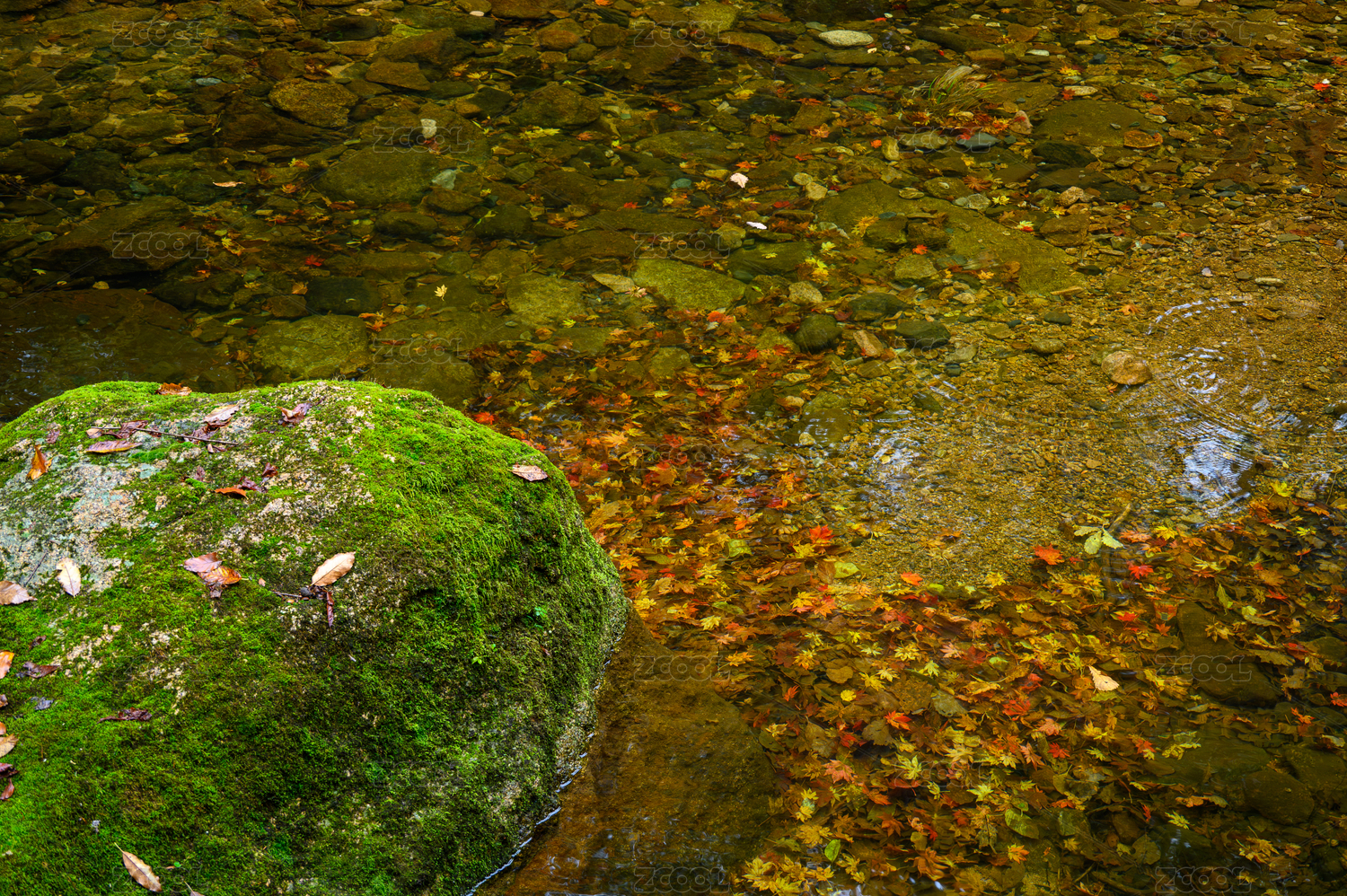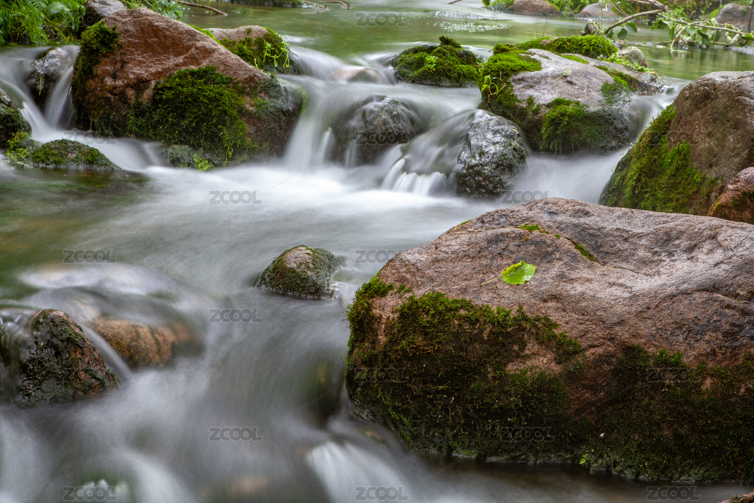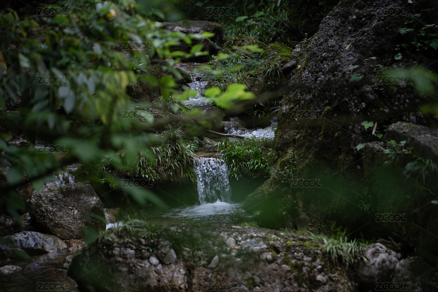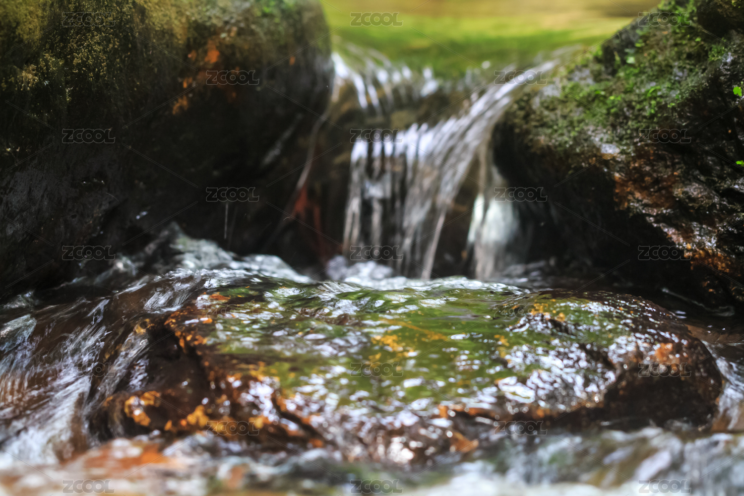 林間從長有青苔的石頭上流過的溪水