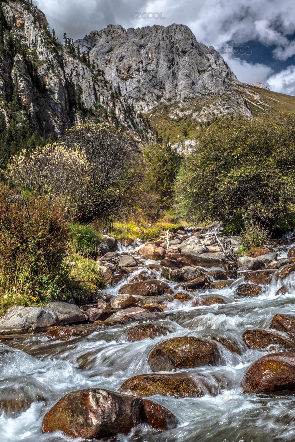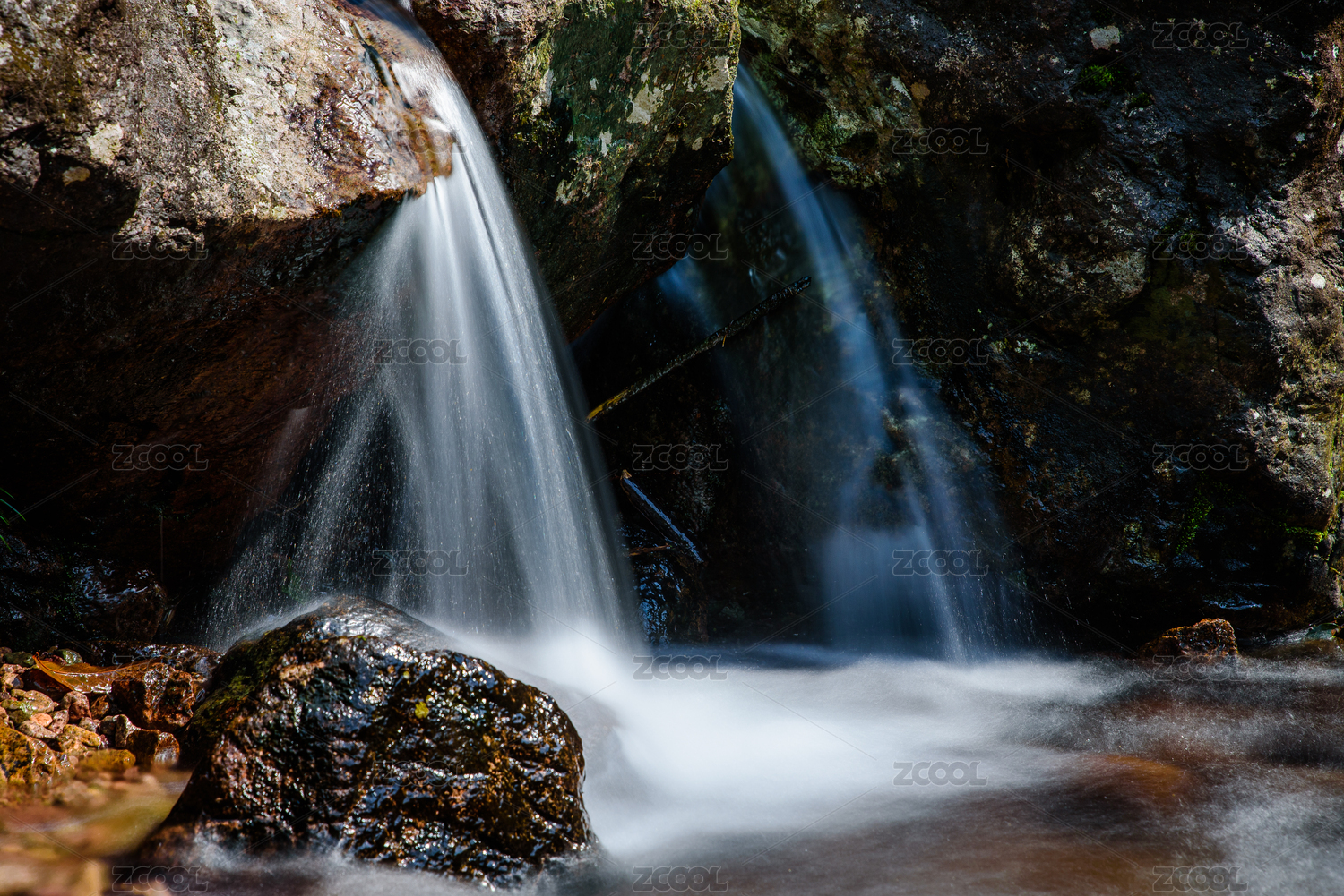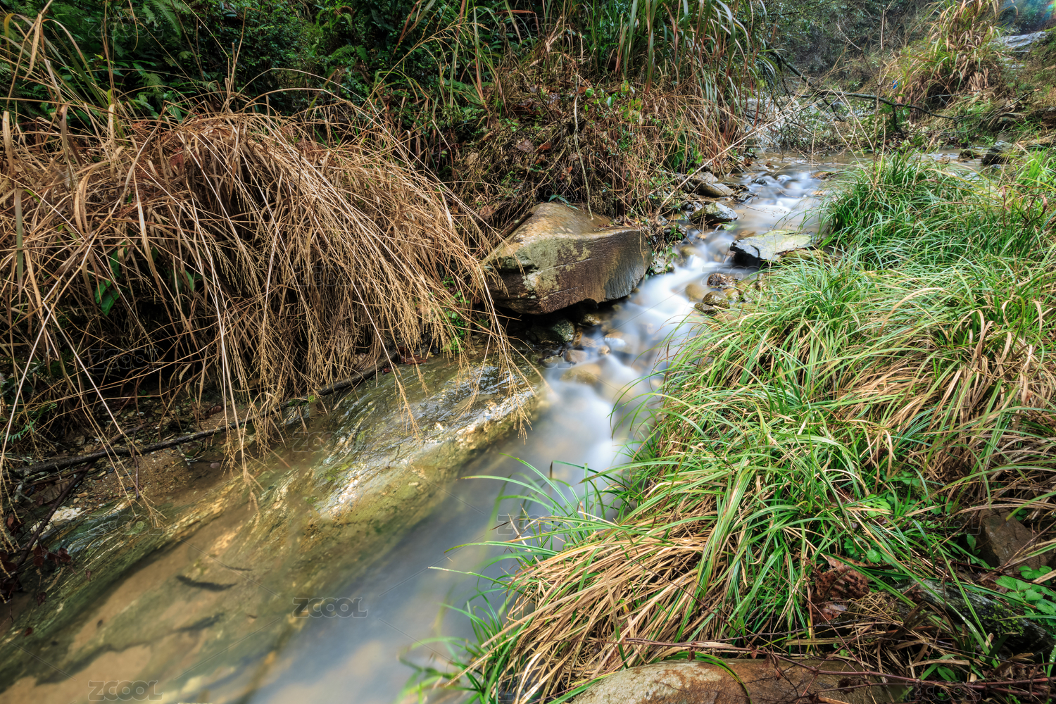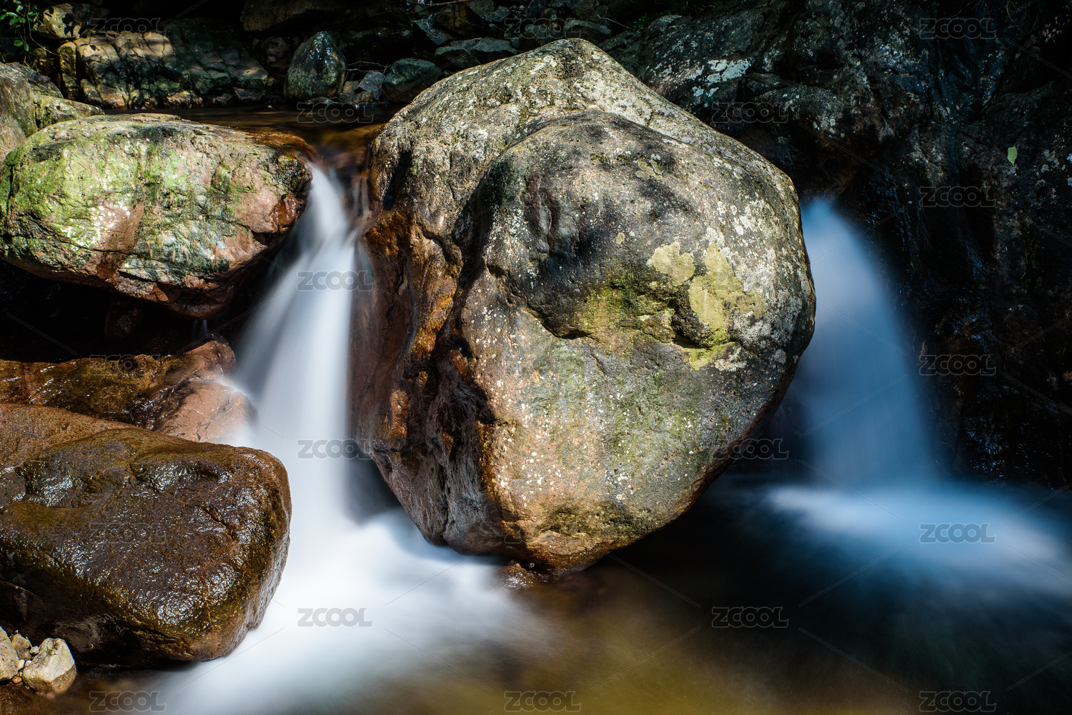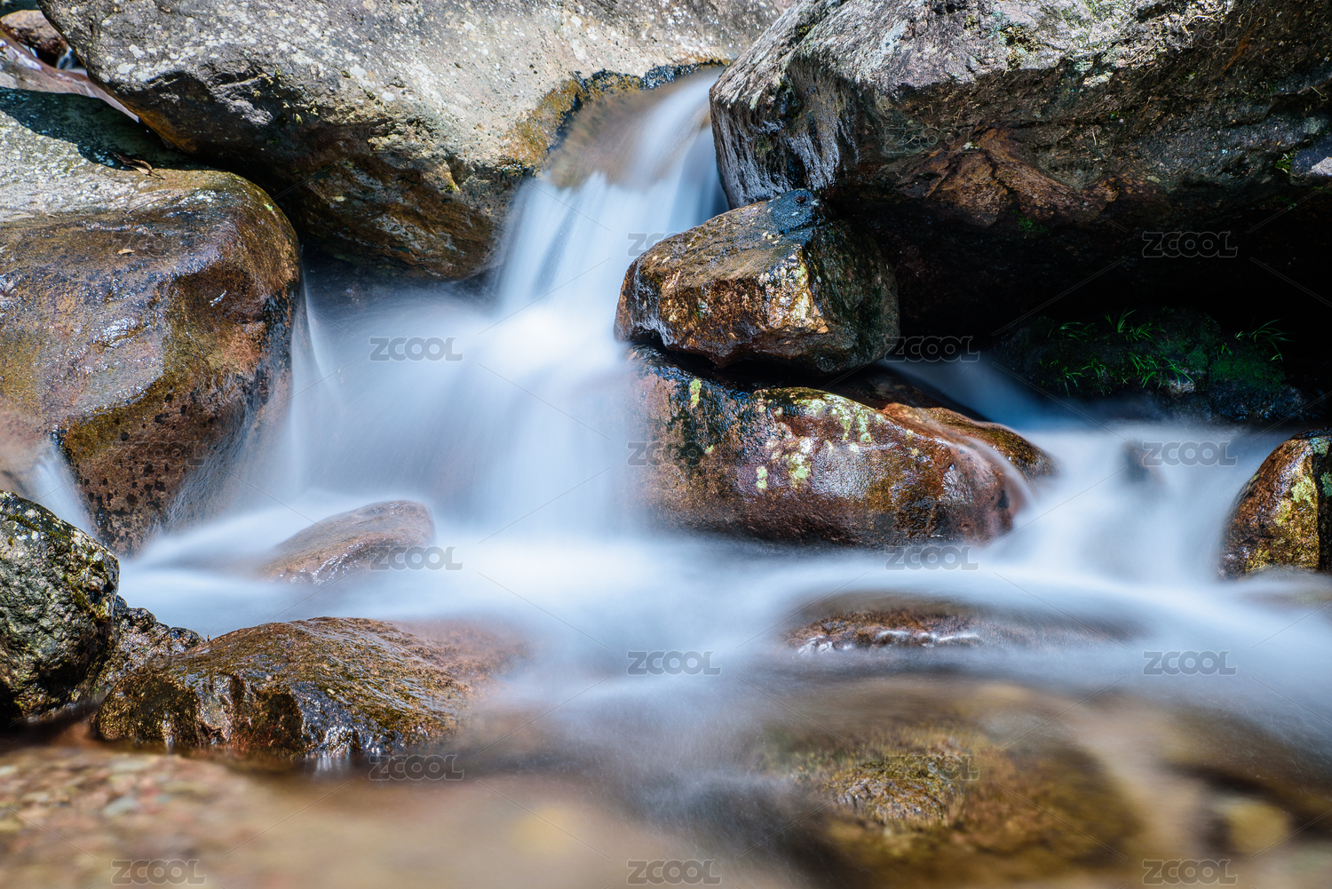 山間巖石上流淌的溪水