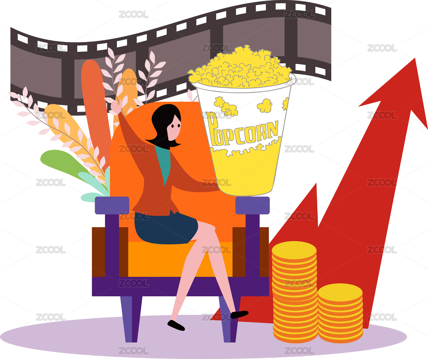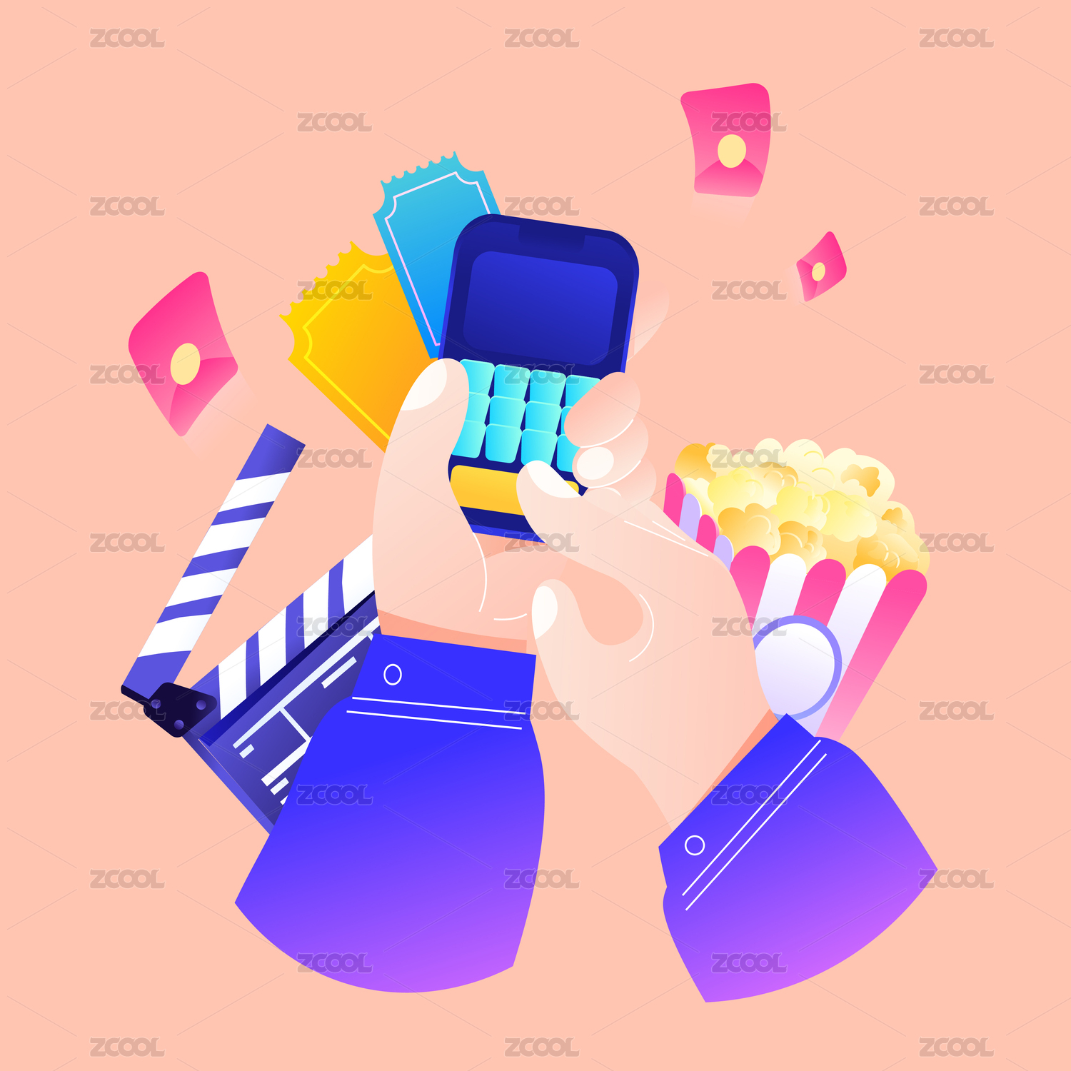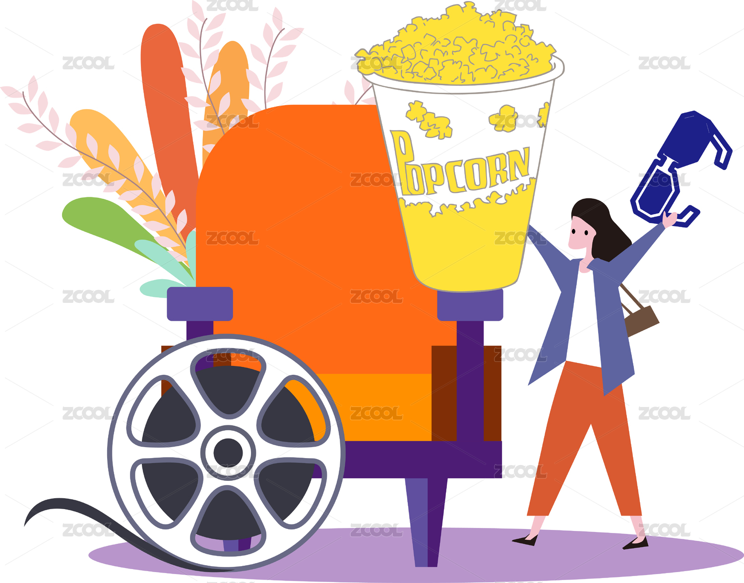 卡通手繪電影院男子手拿爆米花電影票插畫