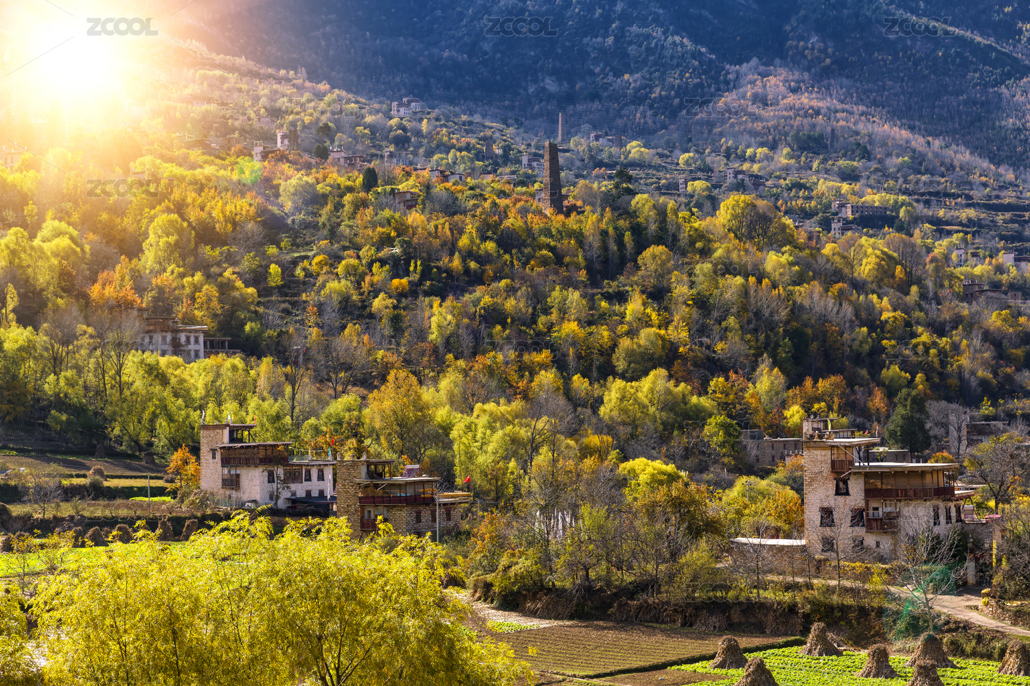中國四川省甘孜州丹巴縣加絨甲居藏寨藏族碉樓的秋季風光