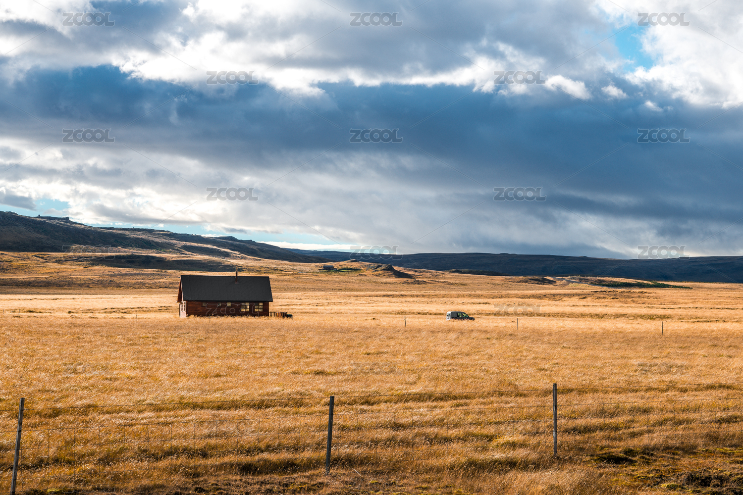 新西蘭南島皇后鎮(zhèn)野外農(nóng)場牧場的金黃秋天和木屋吉普車