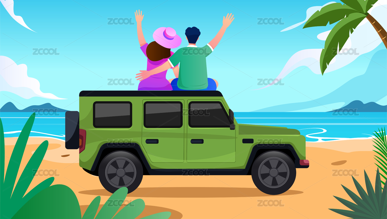 海邊情侶汽車歡呼招手插畫