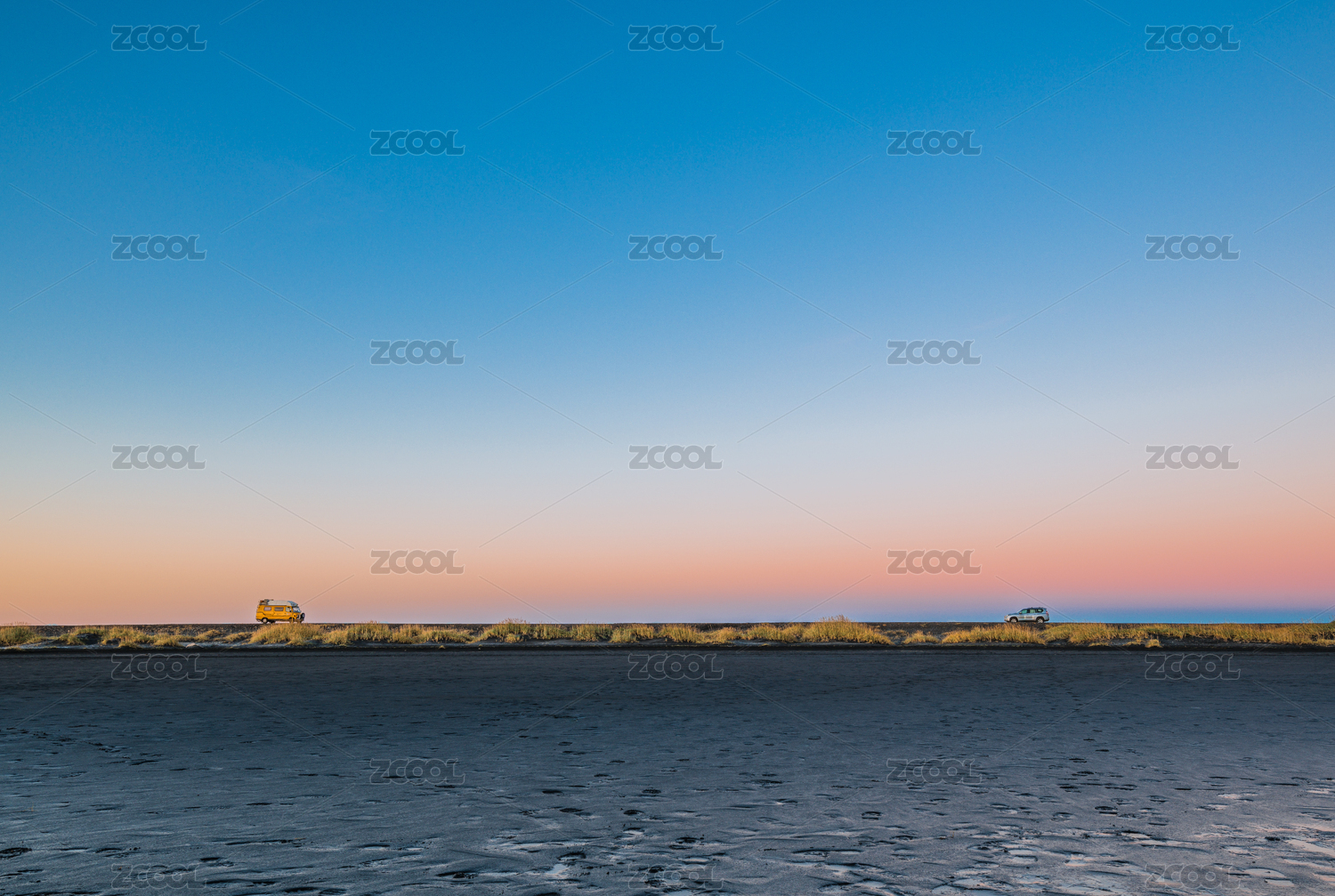 行駛冰島維克小鎮(zhèn)黑沙灘公路美麗夕陽下的黃色房車和越野車