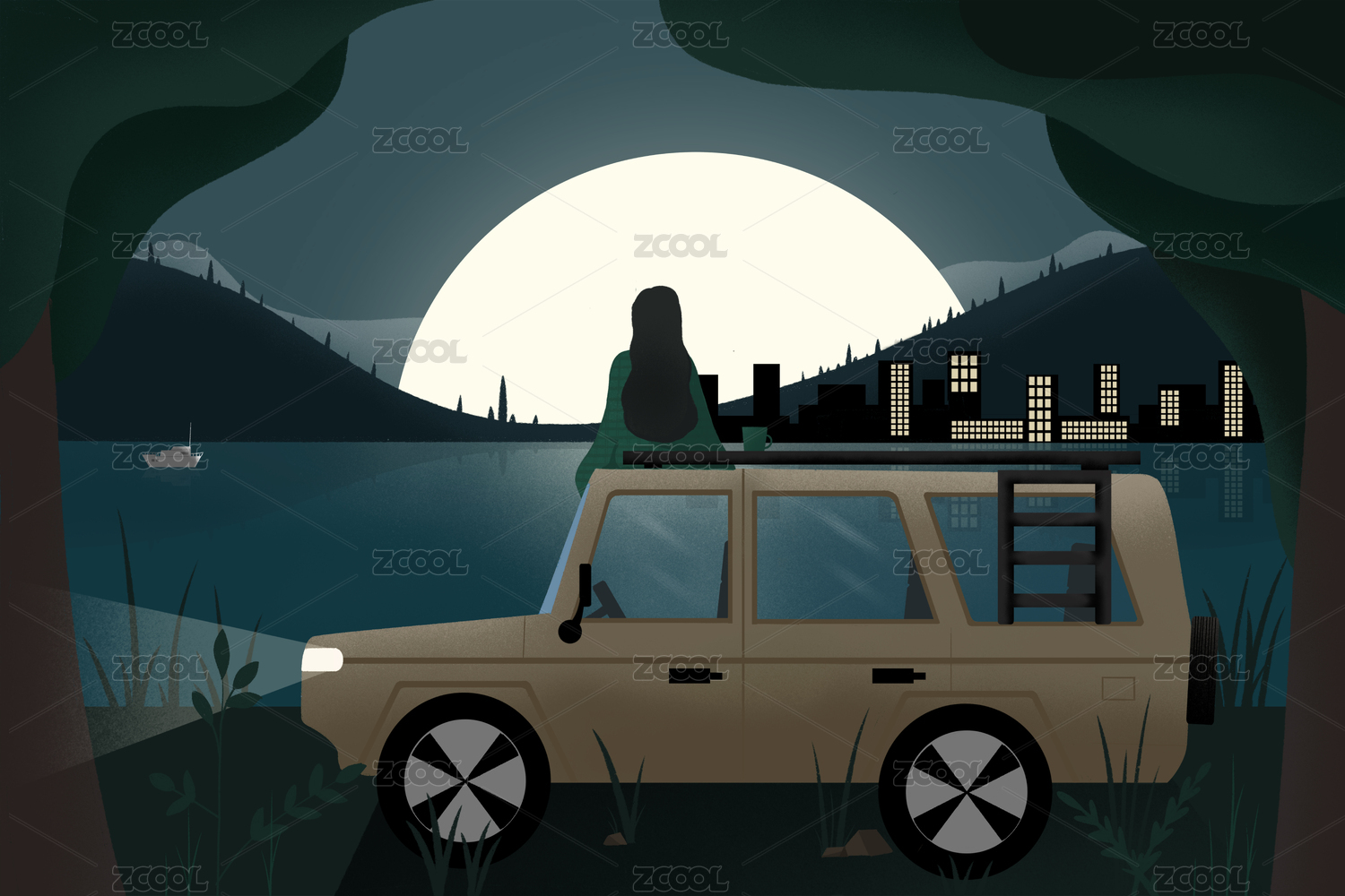 一位女孩在吉普車車頂觀月