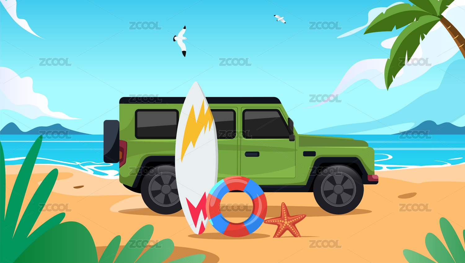 海邊汽車沖浪板游泳圈海洋插畫