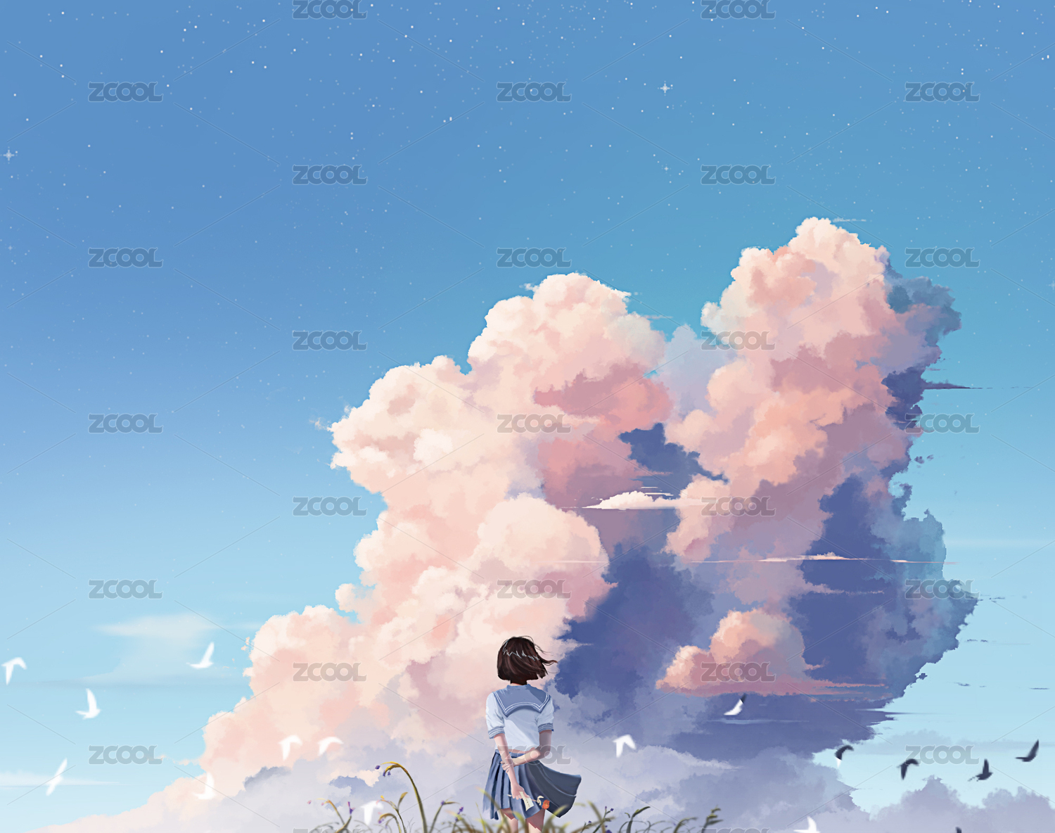 水手服少女眺望夏日陽光下遠方云彩