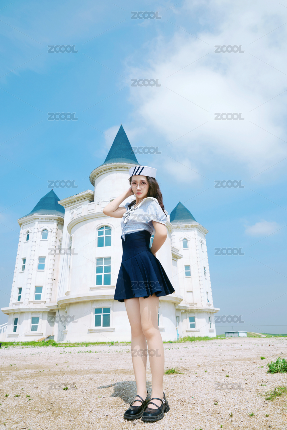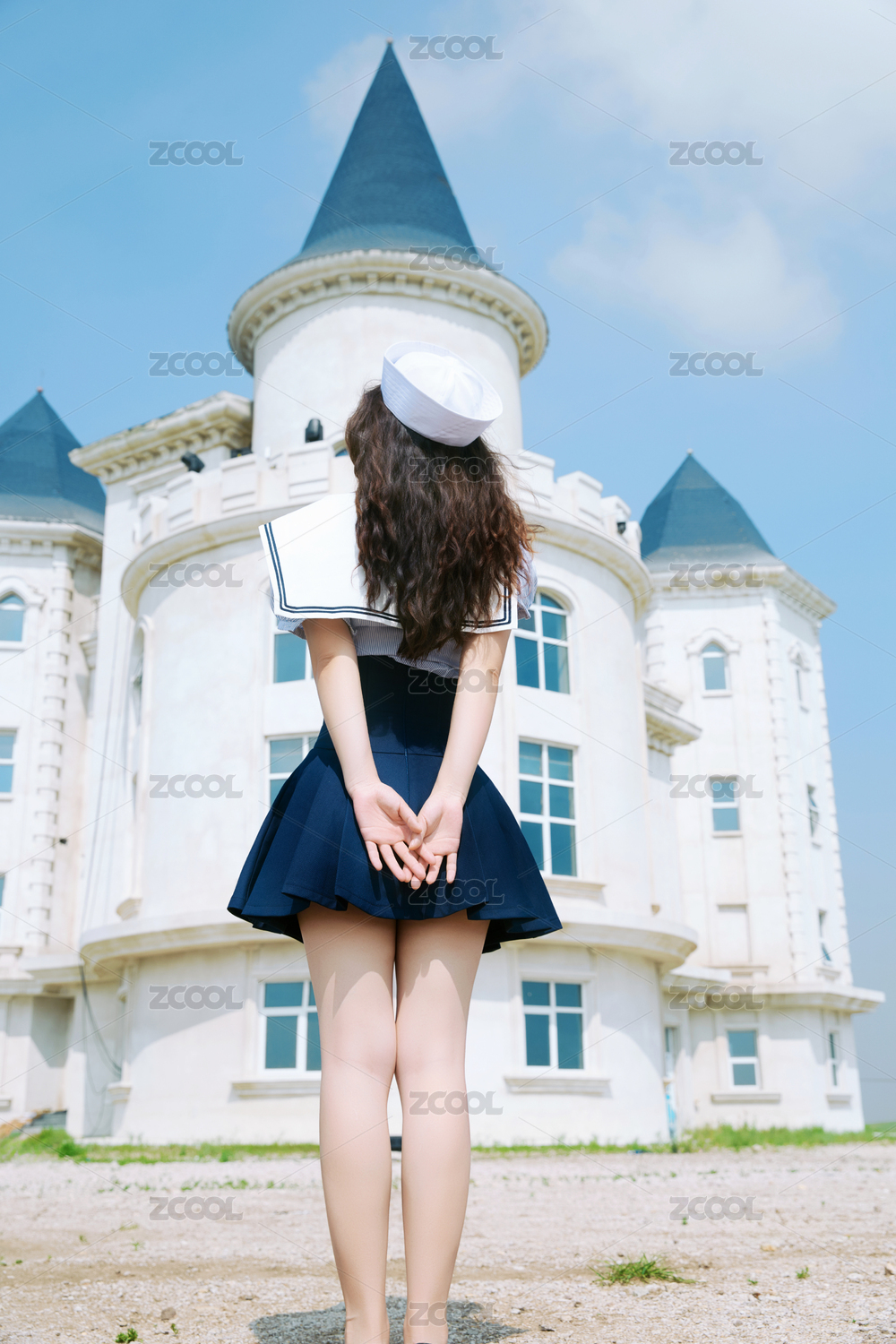 身穿水手服在城堡別墅前拍照打卡的亞洲美女