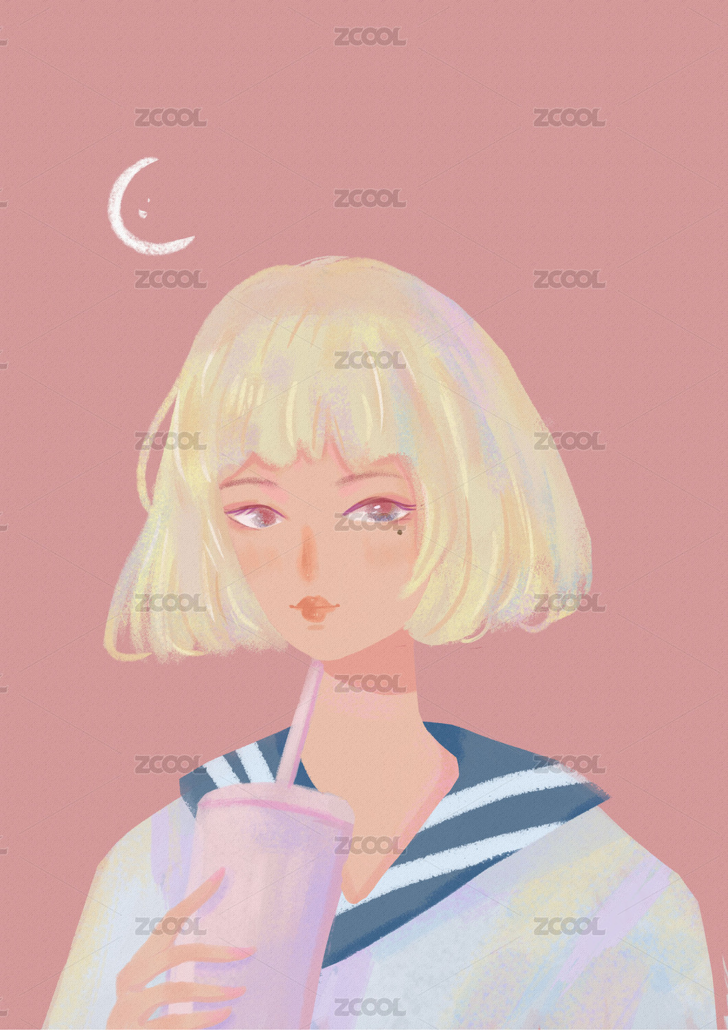 日系小雛菊水手服短發(fā)可愛少女插畫藍色