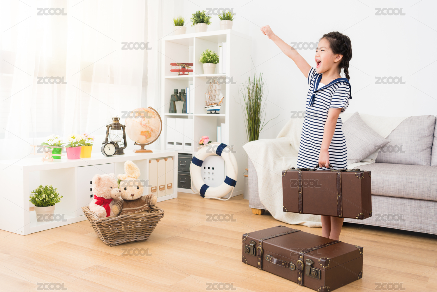 開朗可愛的小女孩穿著旅客水手服裝,手持行李箱的行李站在木地板準備前往。