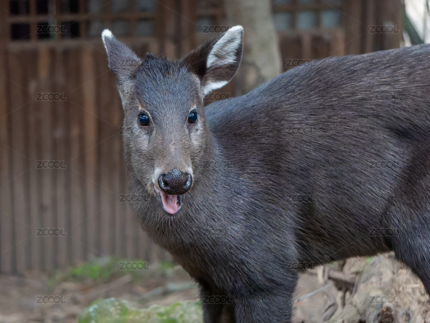 毛冠鹿在冬季張開嘴巴露出紅色的舌頭