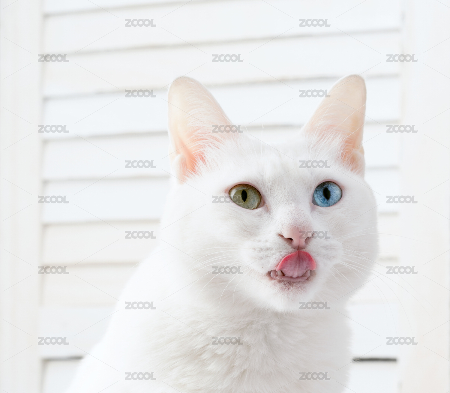 白貓的眼睛一邊是藍色,一邊是黃色。它在舔舌頭