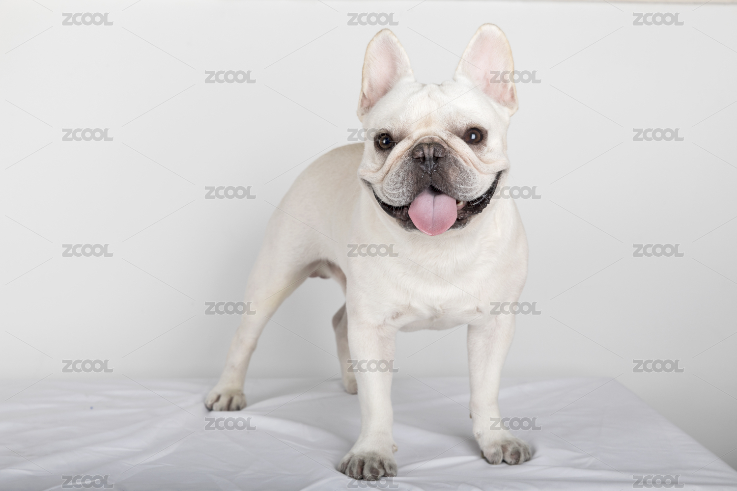 一只抬著頭伸著舌頭的奶白色法國斗牛犬坐在白色背景前拍寵物寫真