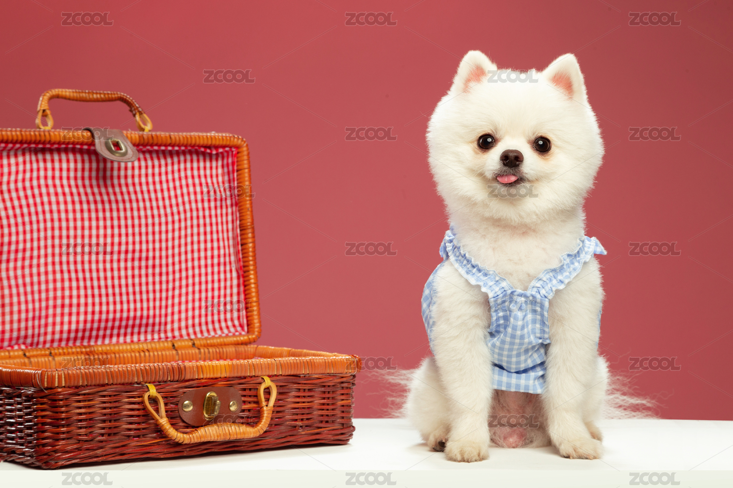 坐在箱子邊吐舌頭的博美犬正面 純色背景