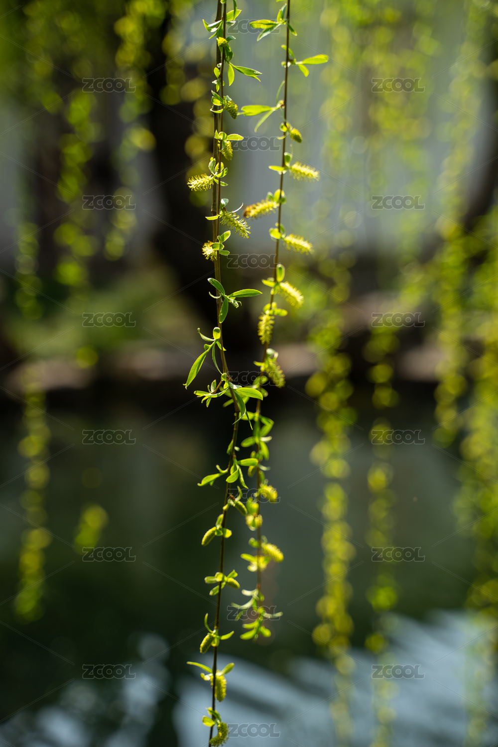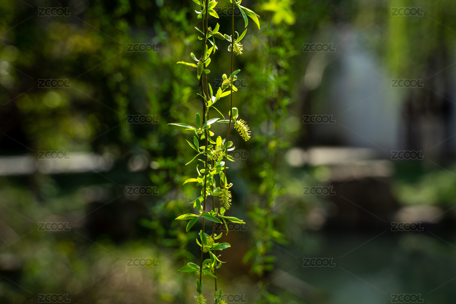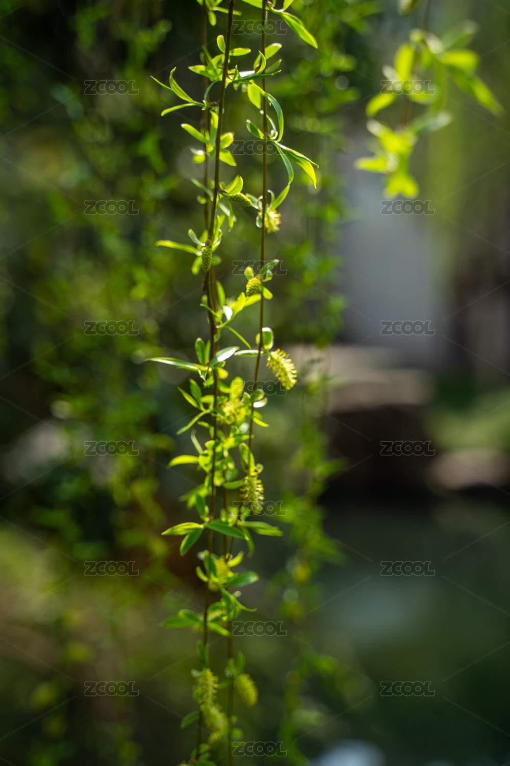 春天逆光下的垂柳新芽