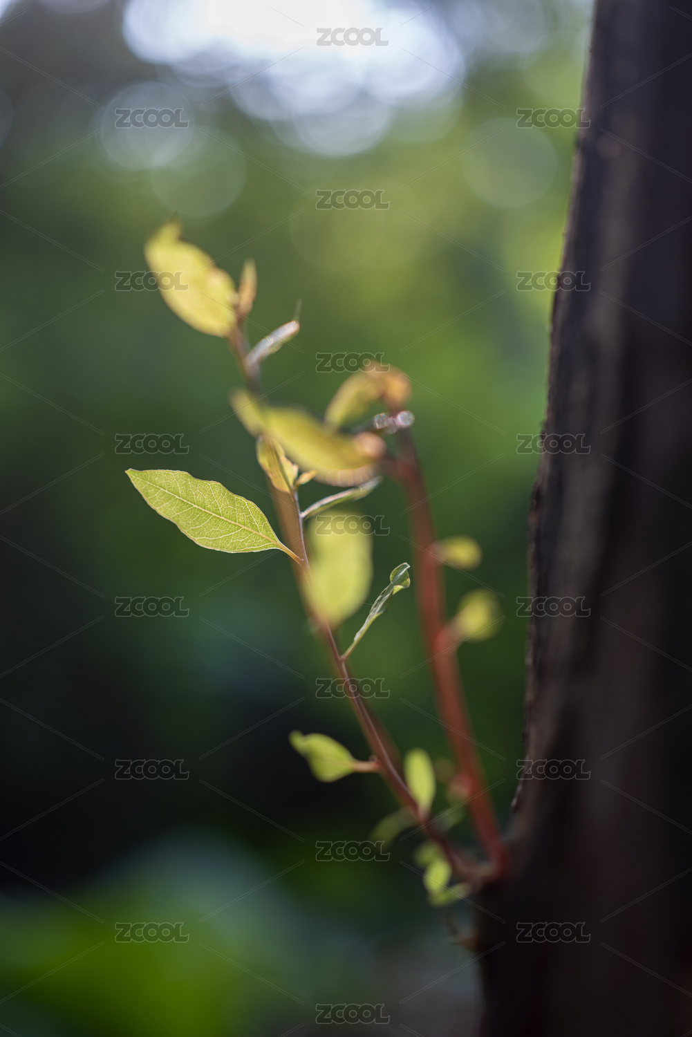 粗壯的老樹干上長出的嫩葉新芽特寫