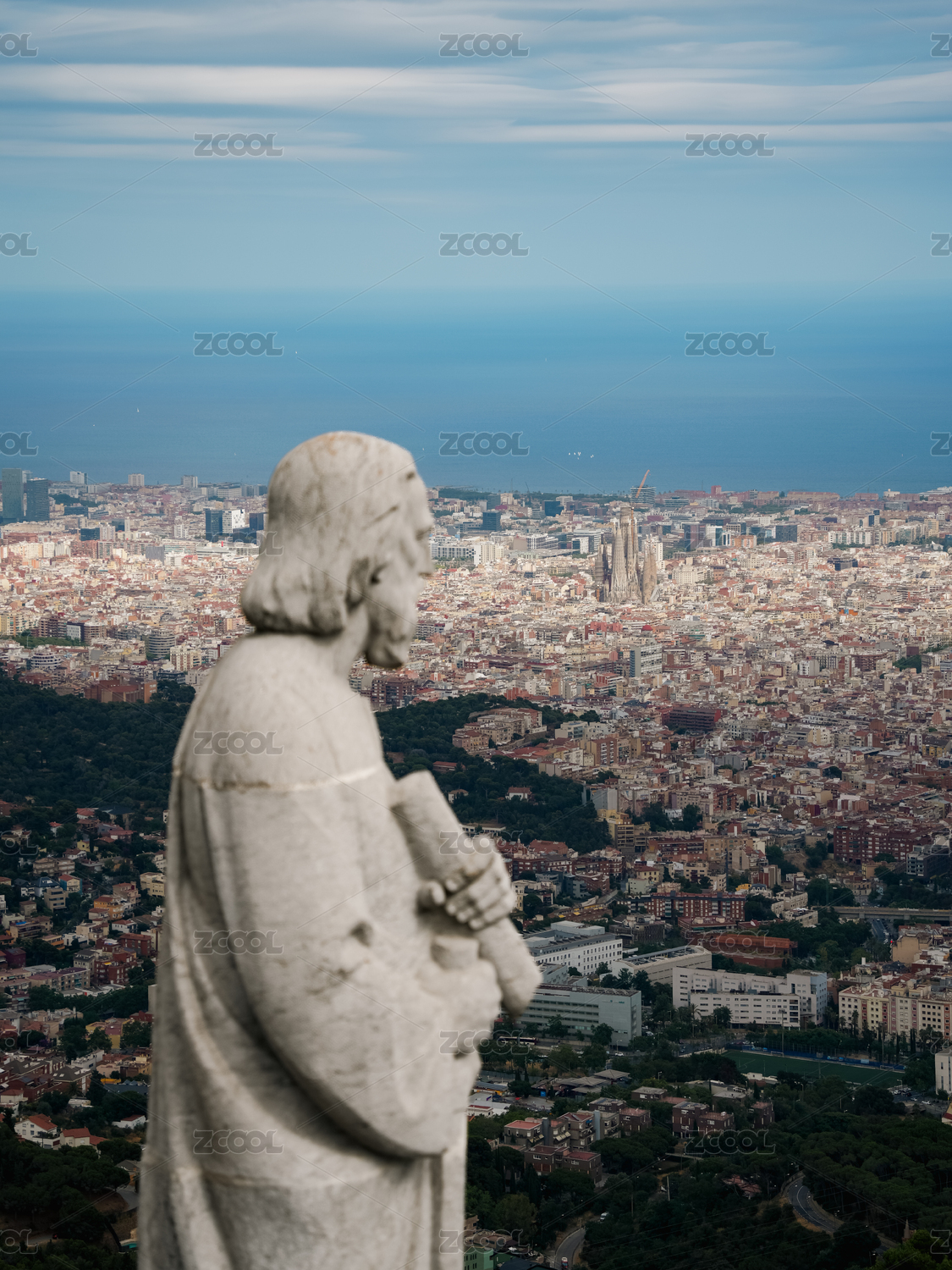 西班牙巴塞羅那山頂石雕與城市俯瞰景觀