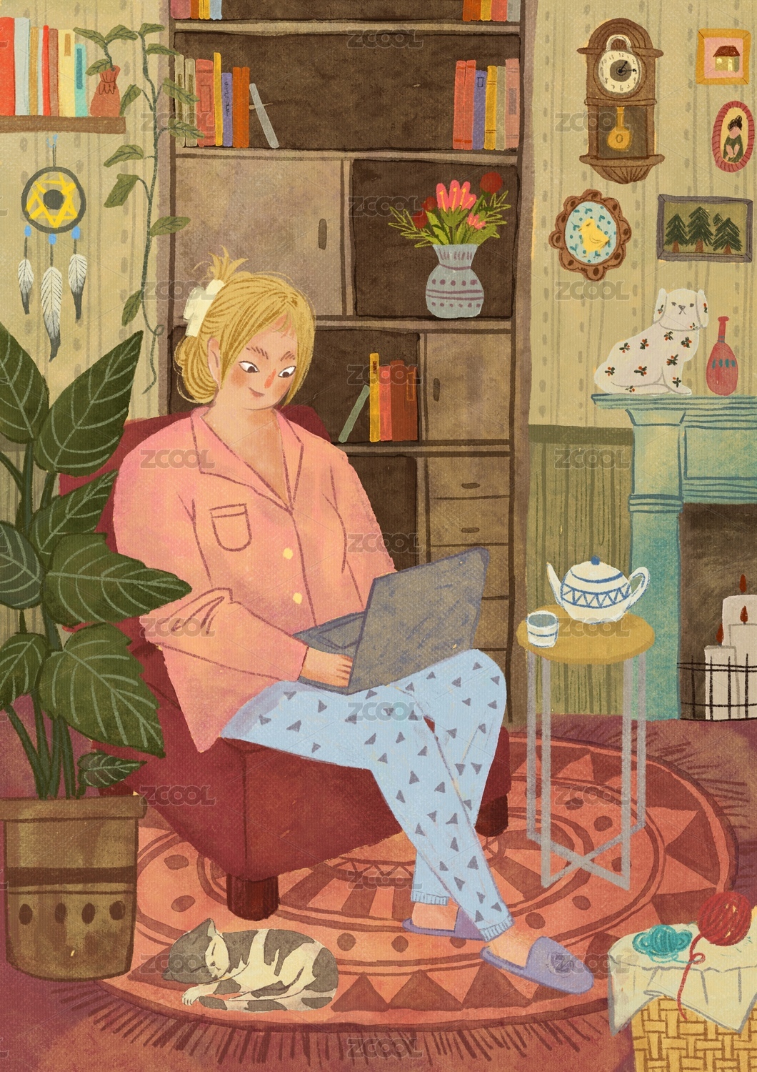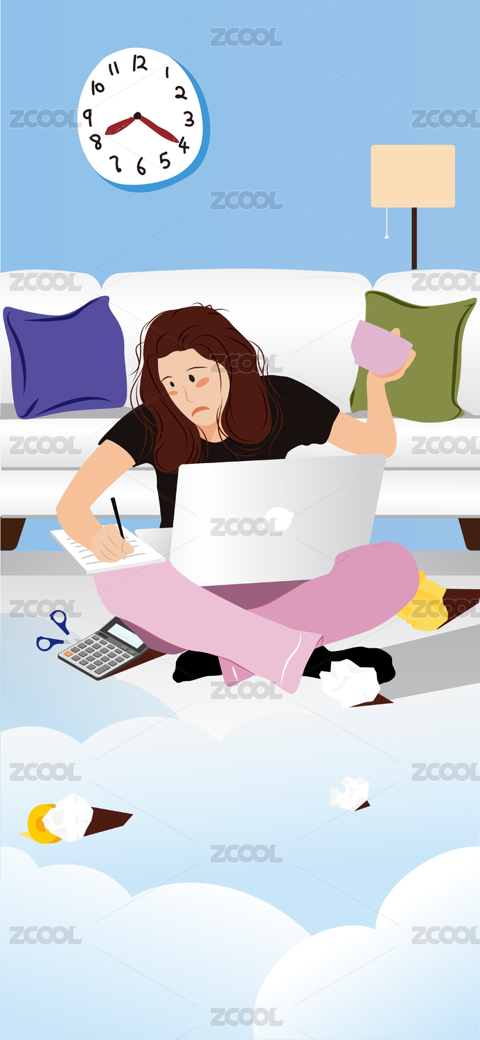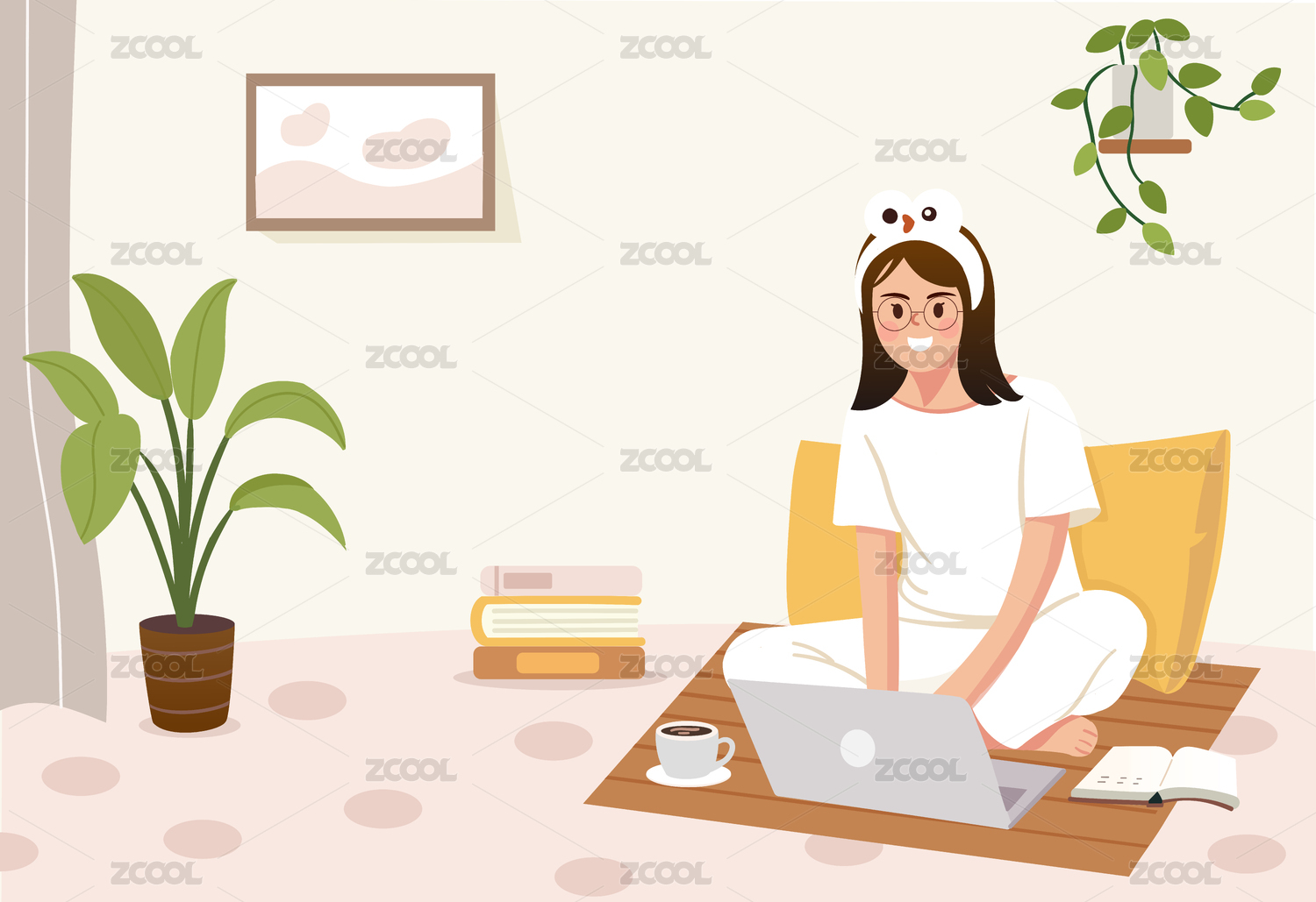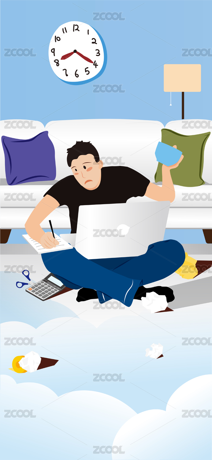 一個男子坐在沙發(fā)上居家辦公桌子書本矢量插畫