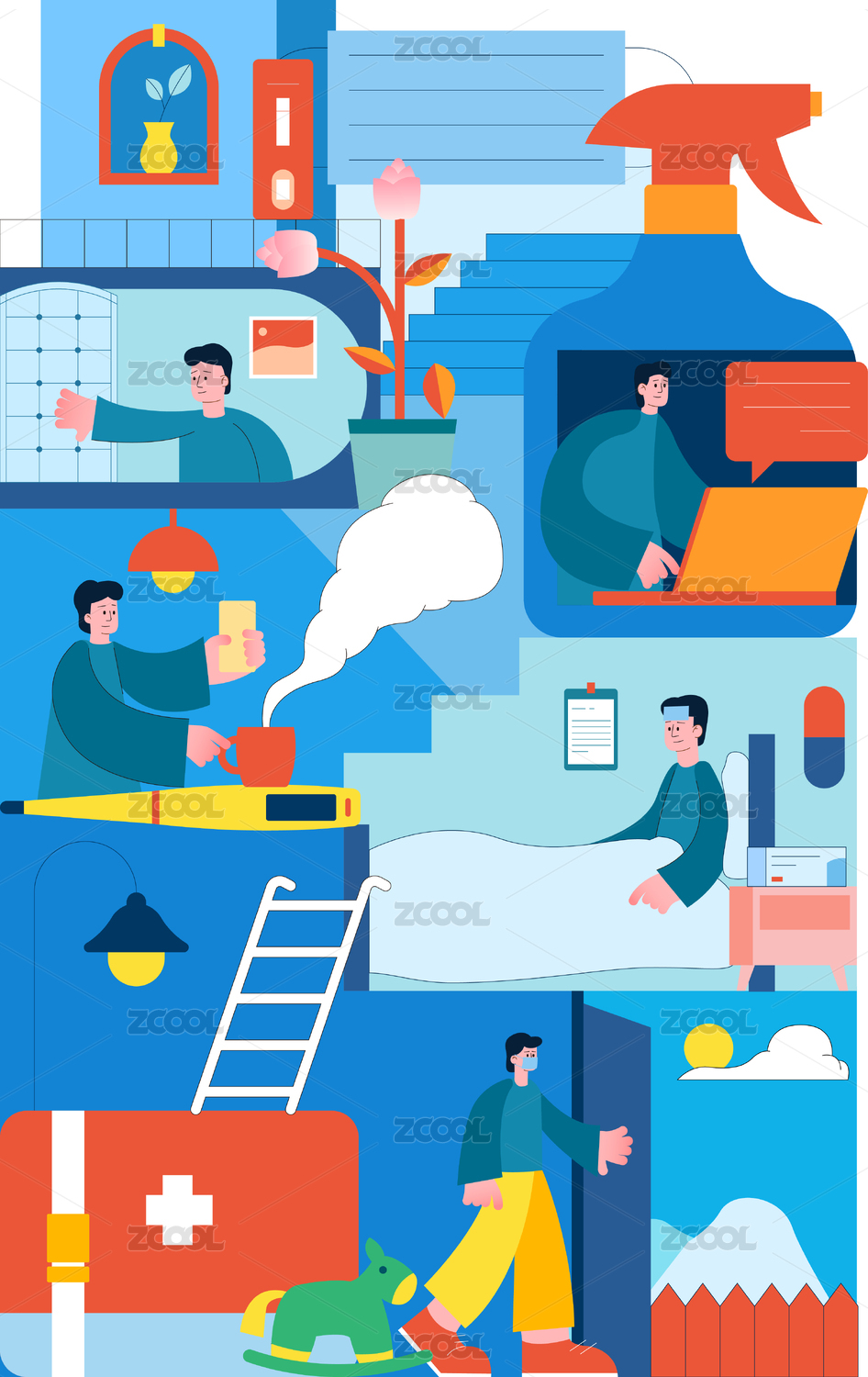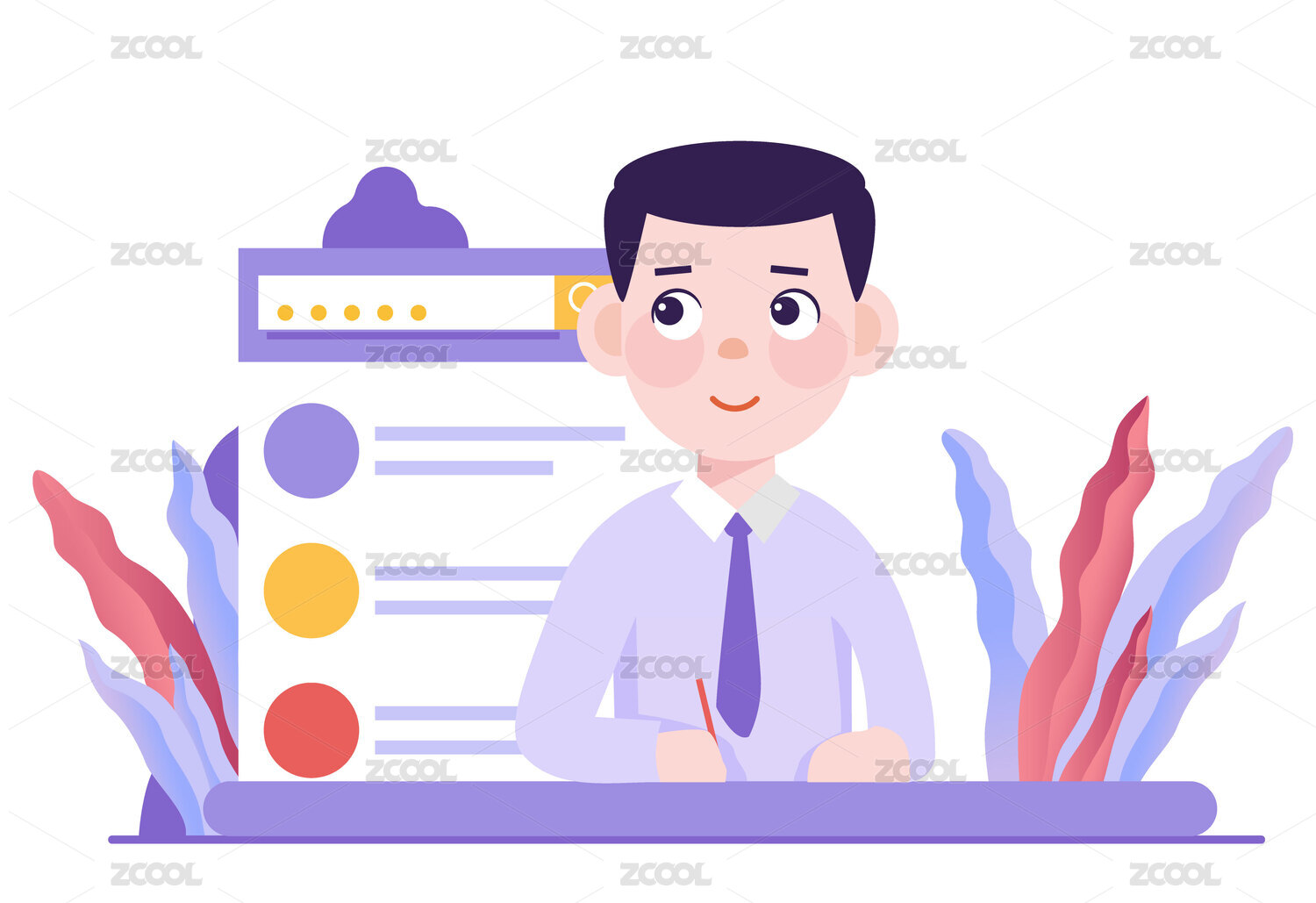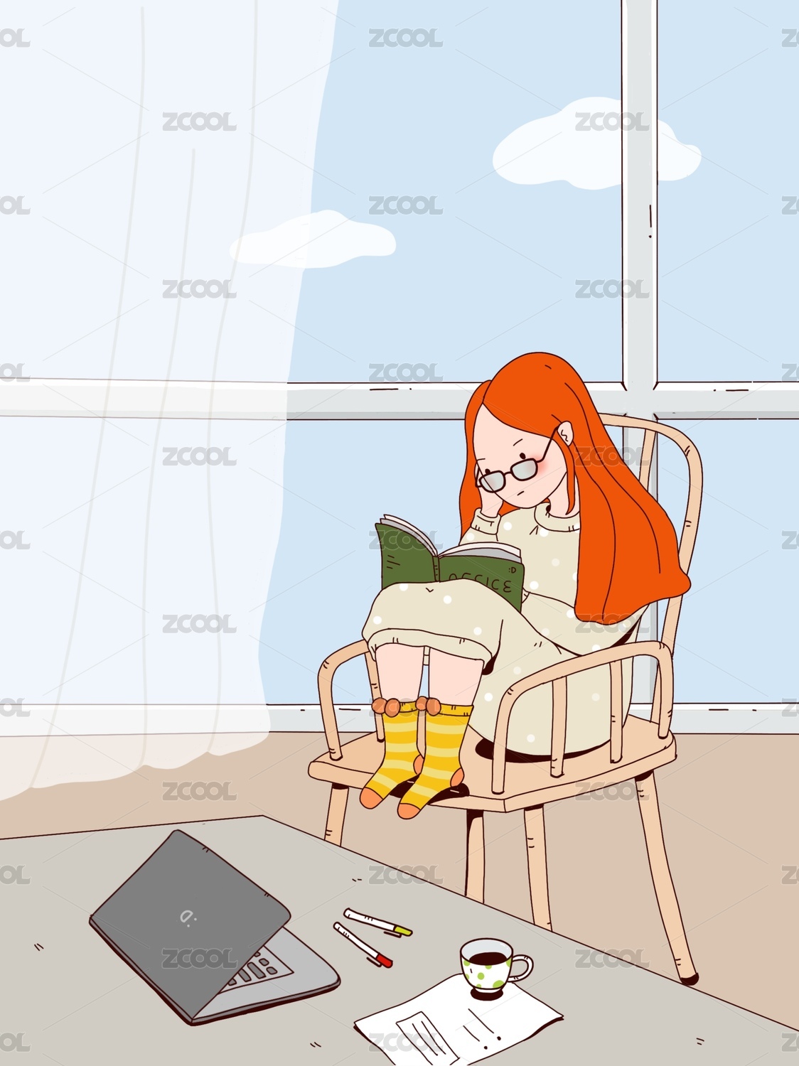 一個男子坐在沙發(fā)上居家辦公桌子書本矢量插畫
