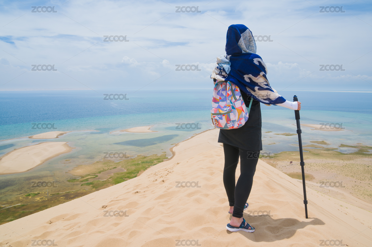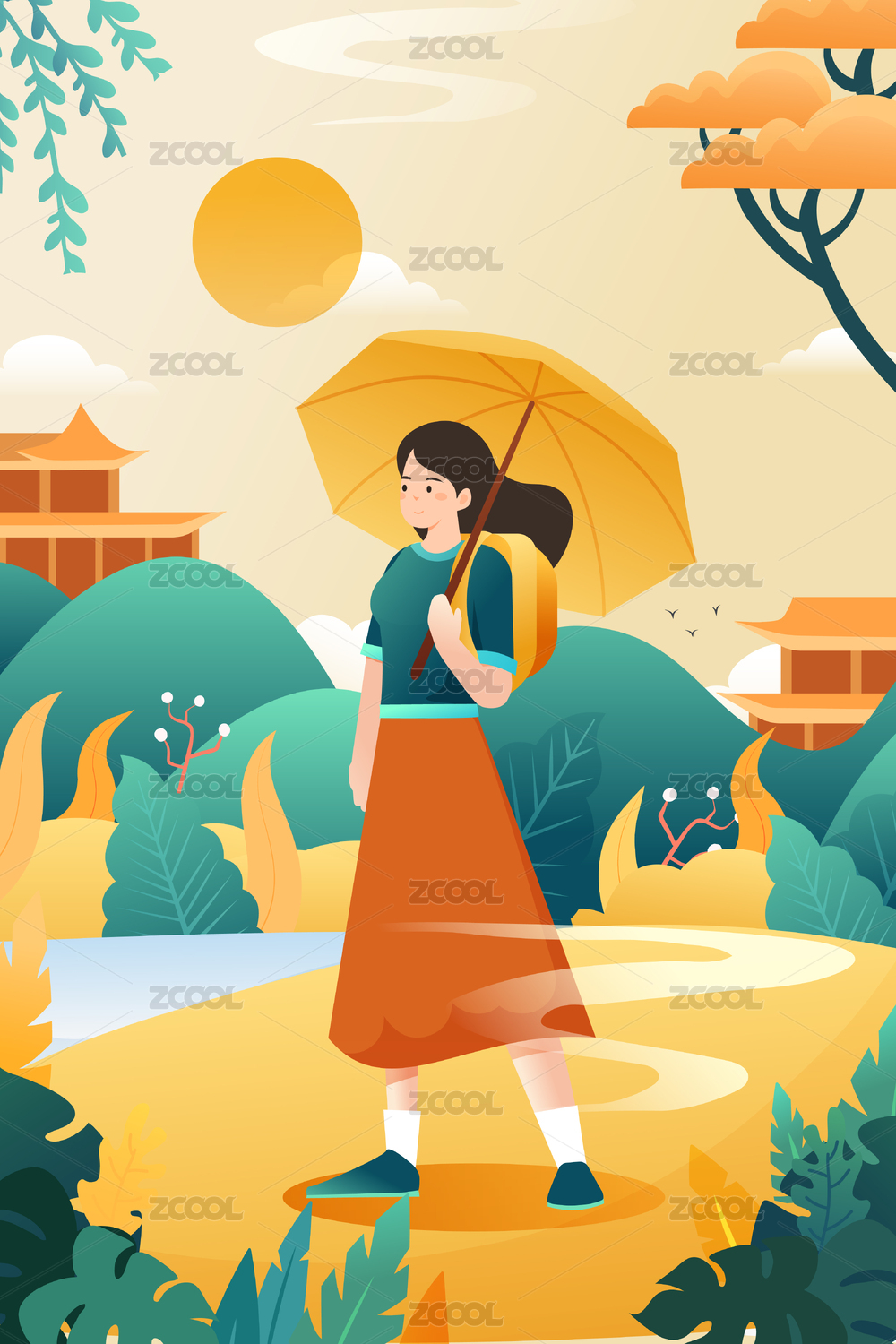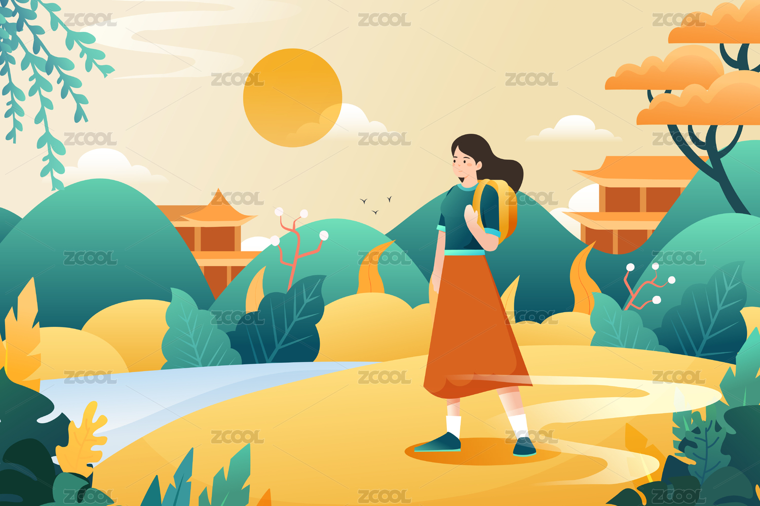 一個(gè)女孩在景區(qū)游覽風(fēng)景矢量插圖
