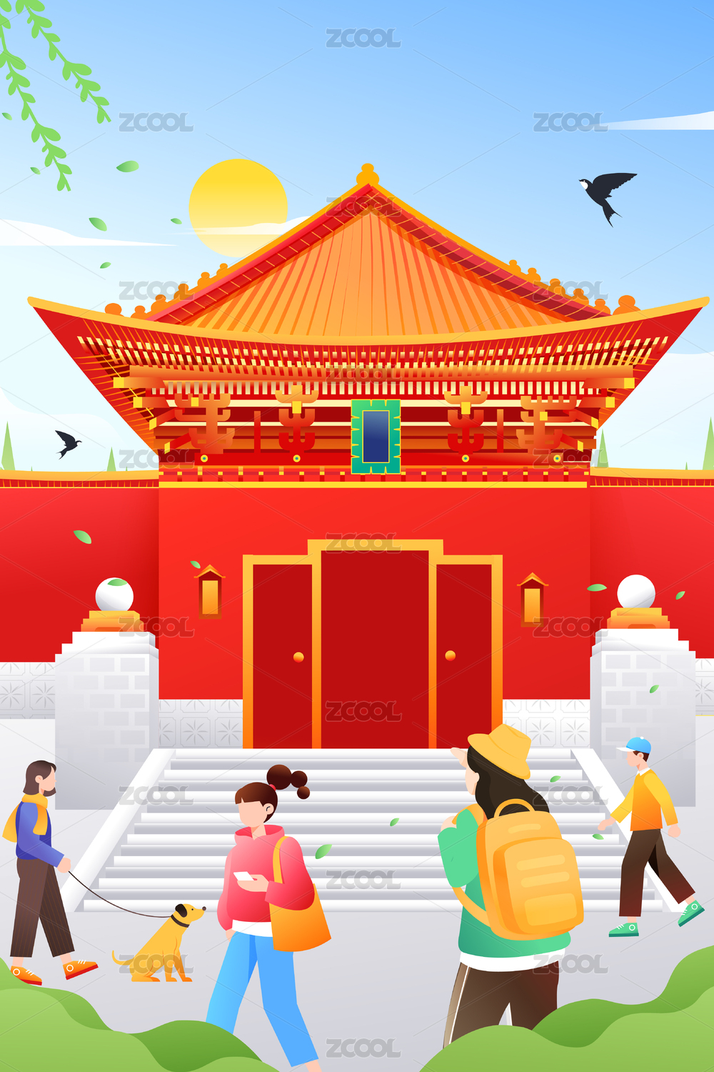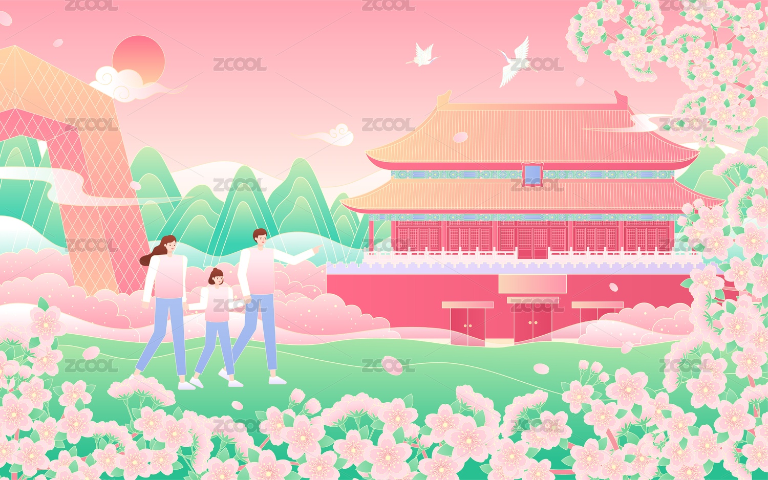 卡通立春出行踏青觀賞景區(qū)游覽風(fēng)景背景矢量插畫