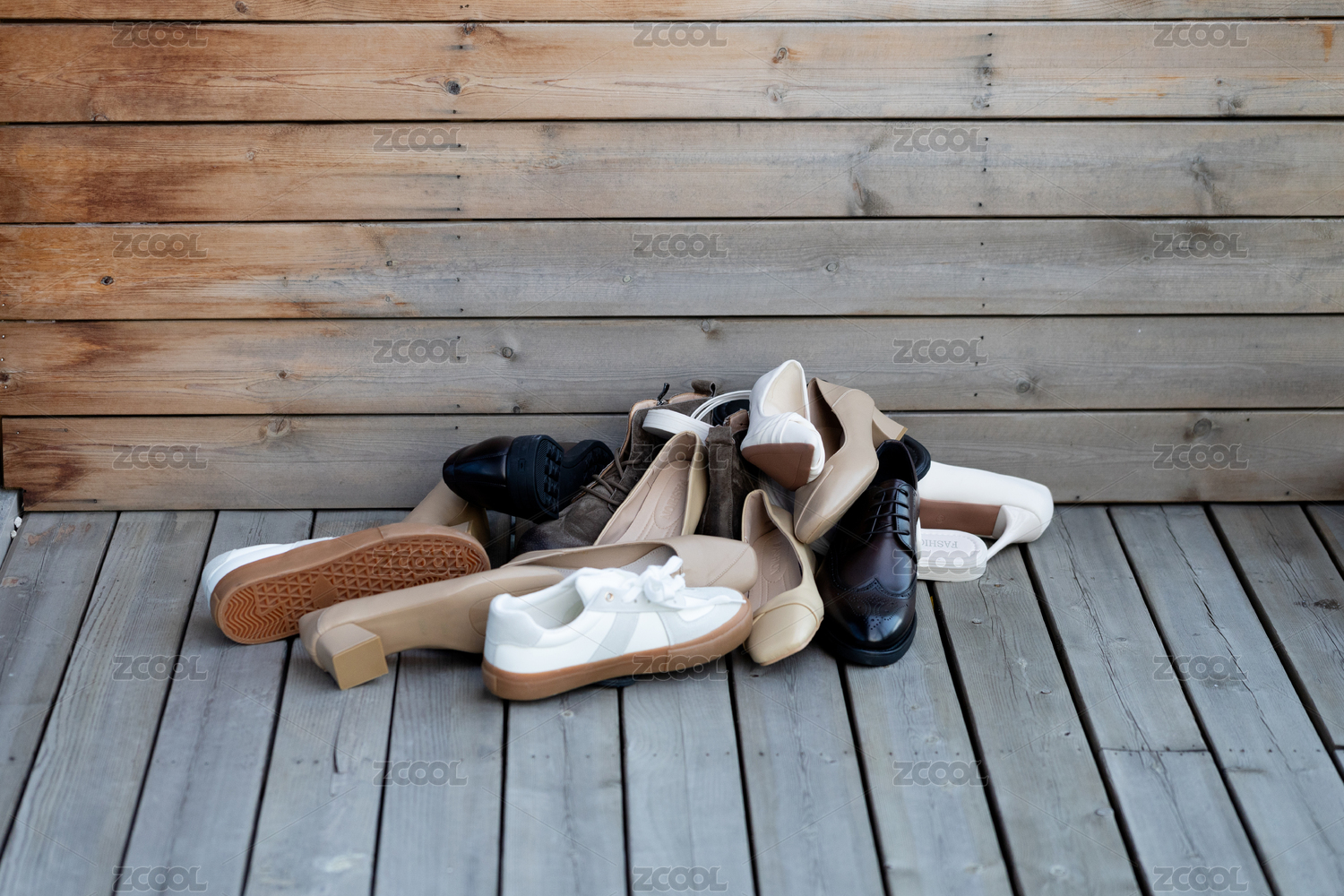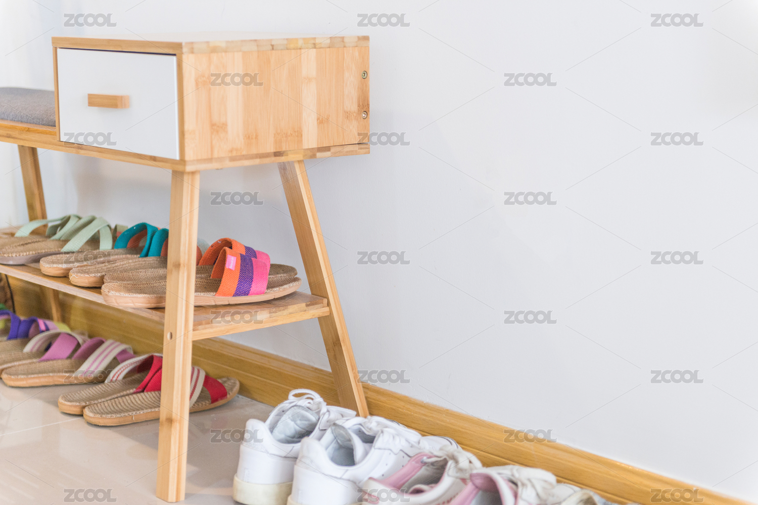 白色墻壁邊的換鞋凳和整齊擺放的鞋子