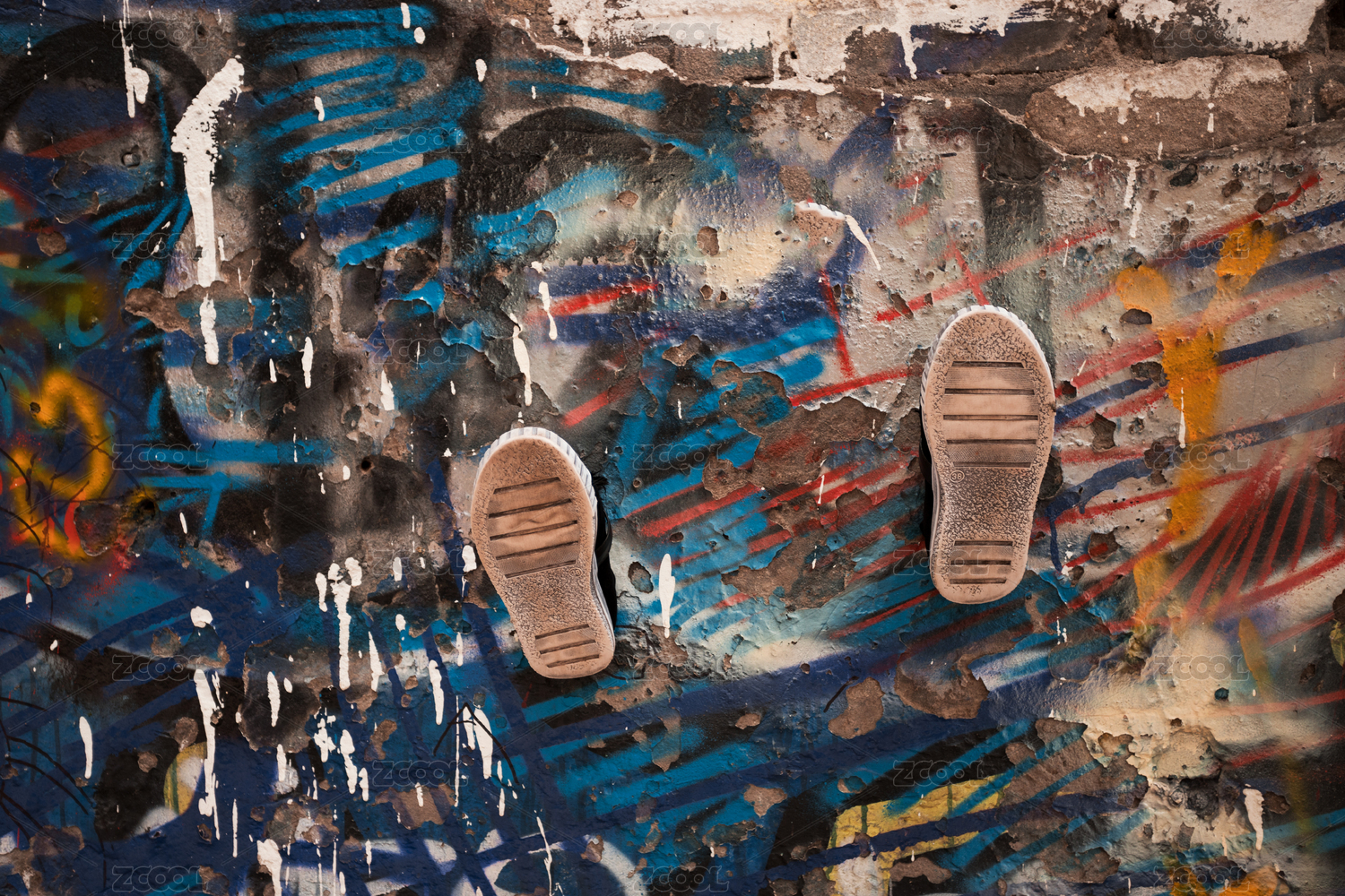 斑駁的涂鴉墻上掛著一雙小鞋子
