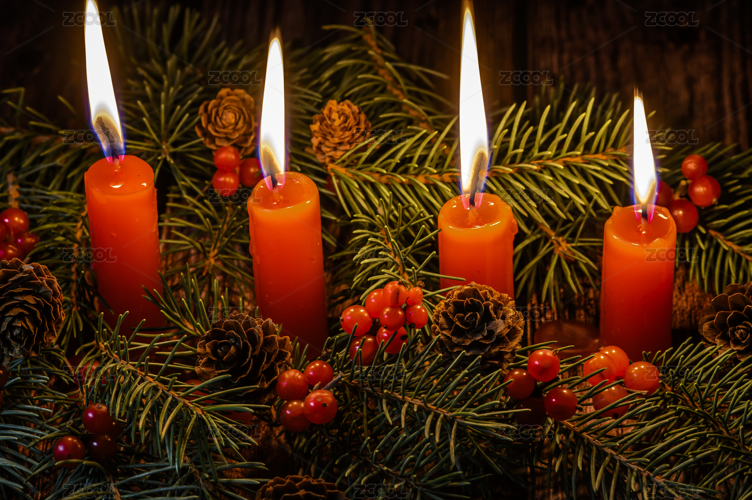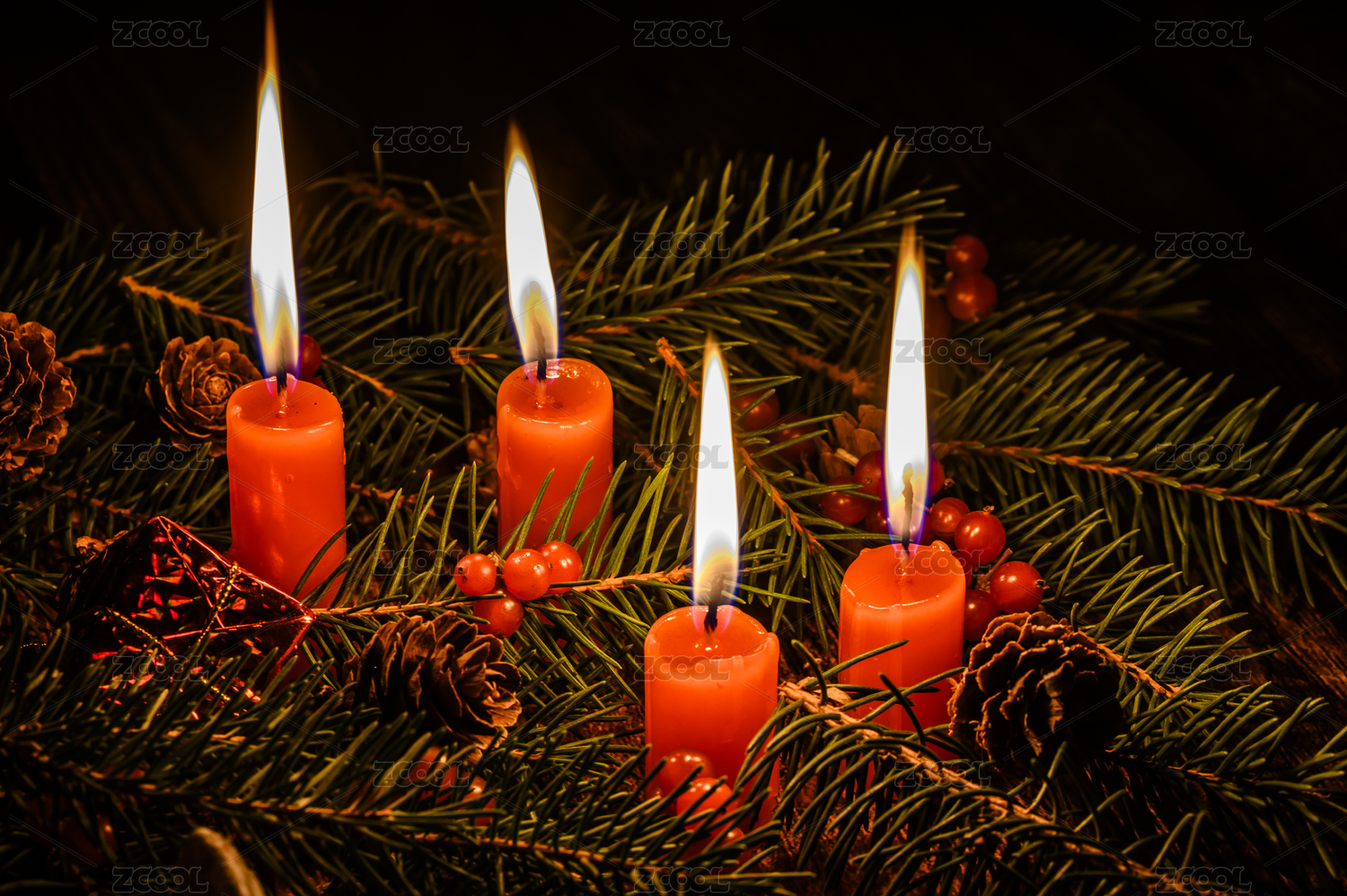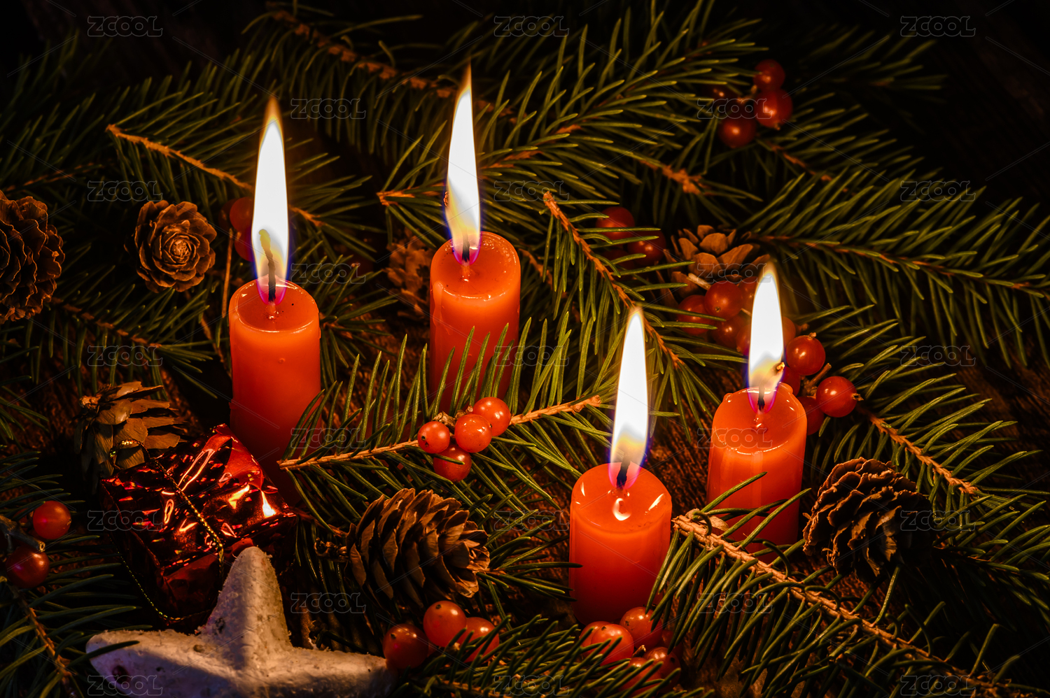 擺放在木質(zhì)桌面上的圣誕樹、紅漿果和燃燒中的紅色蠟燭