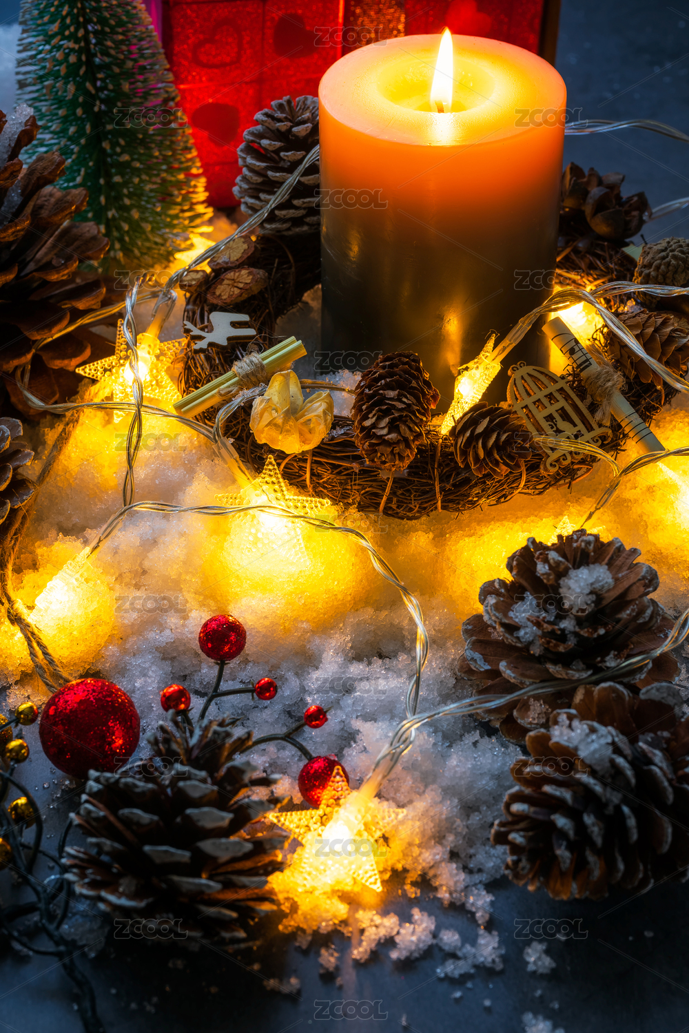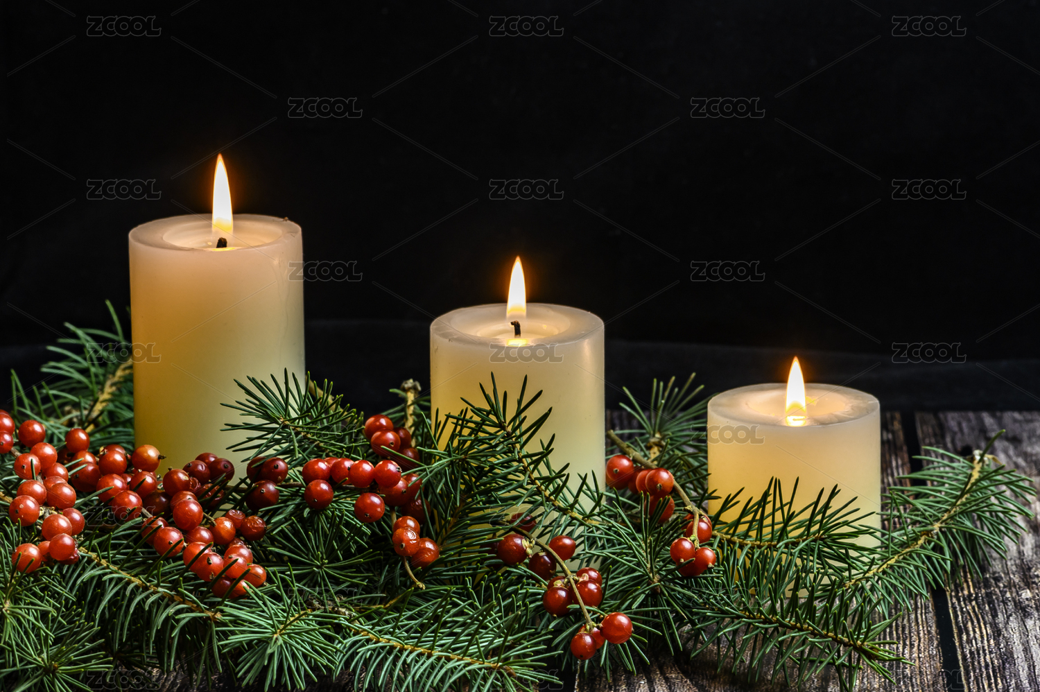 擺放在木質(zhì)桌面上的圣誕樹、紅漿果和燃燒中的白色蠟燭