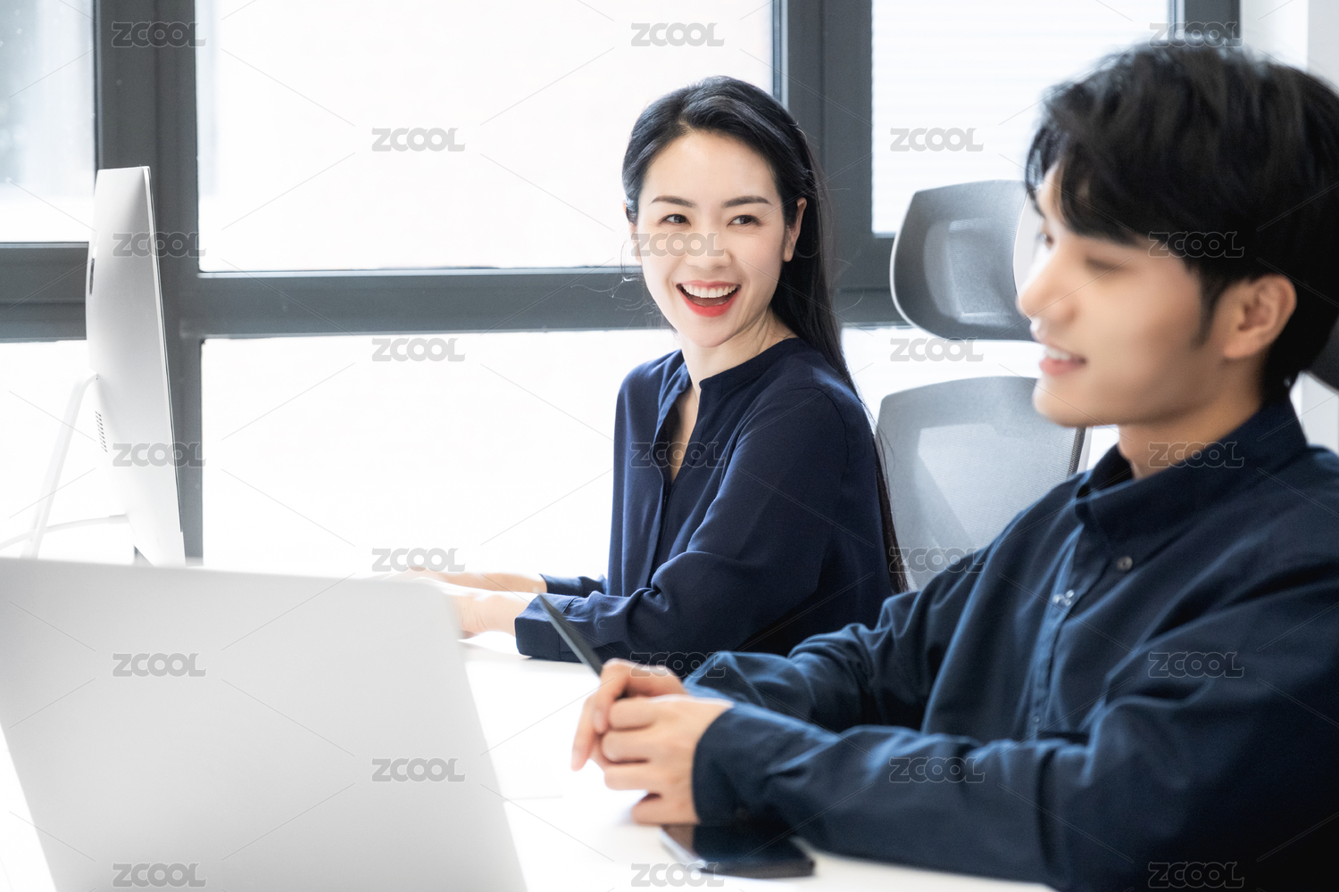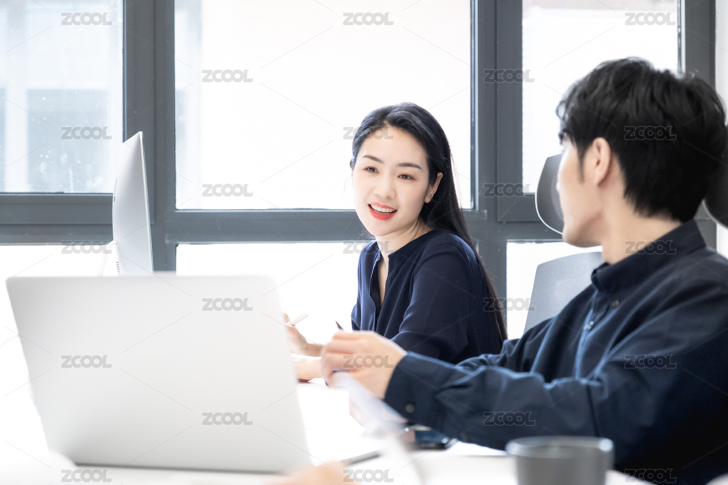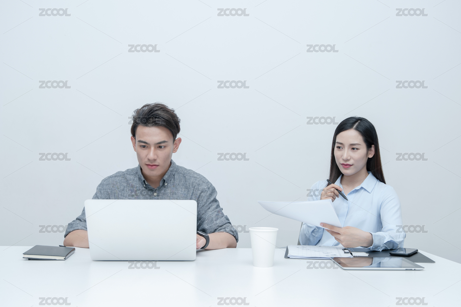 在白色辦公桌前溝通工作的年輕男女白領(lǐng)