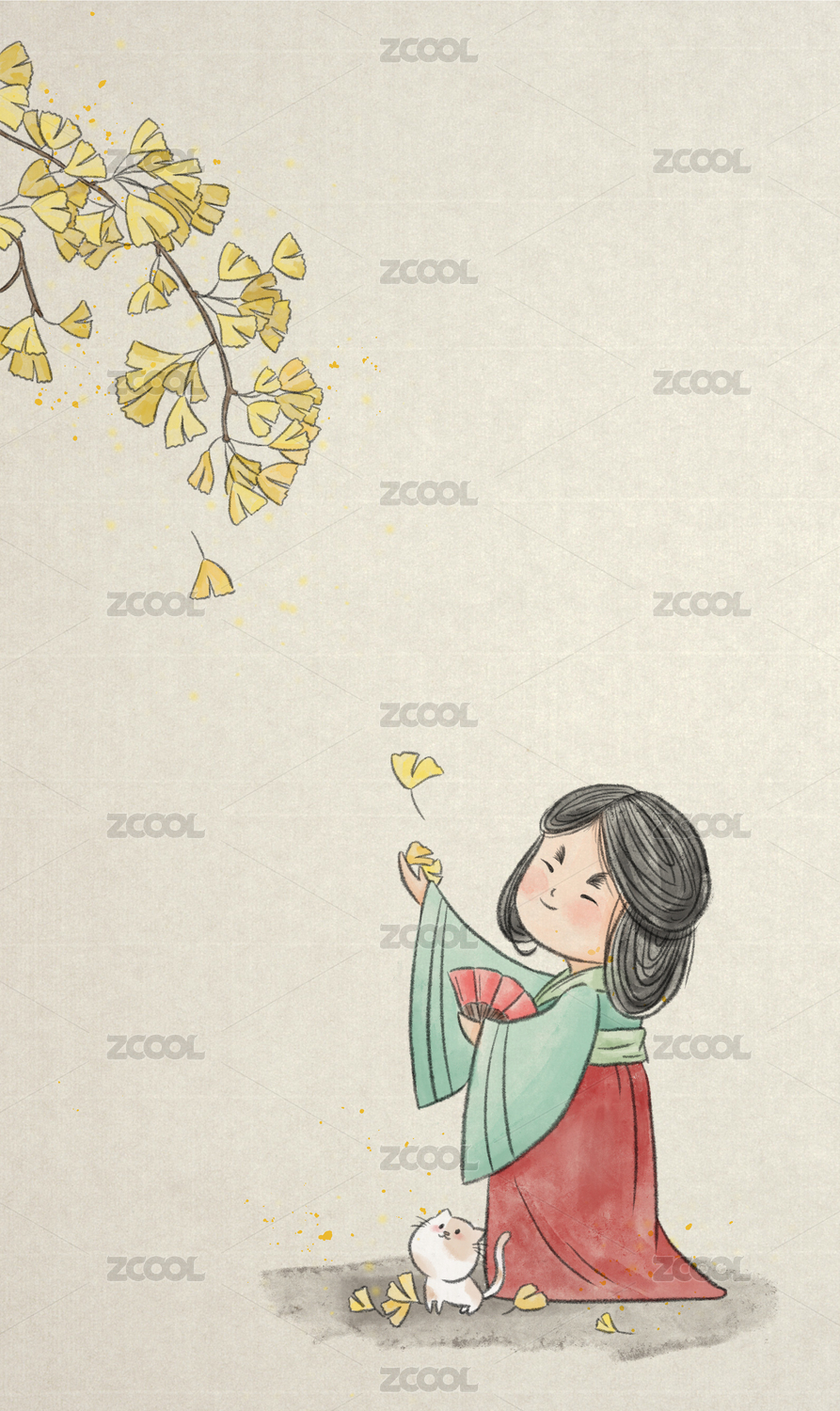 秋季銀杏葉和唐朝女孩中國風(fēng)古風(fēng)水墨插畫