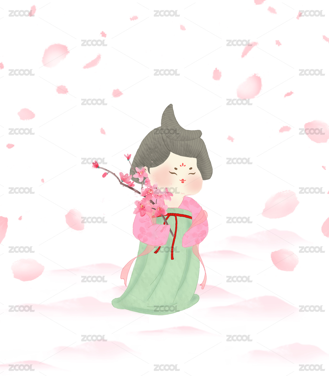 唐朝美人貴妃手拿粉紅色桃花踽踽前行