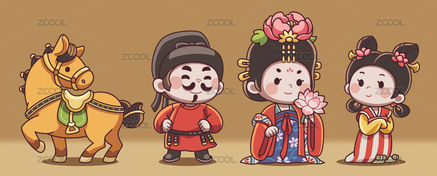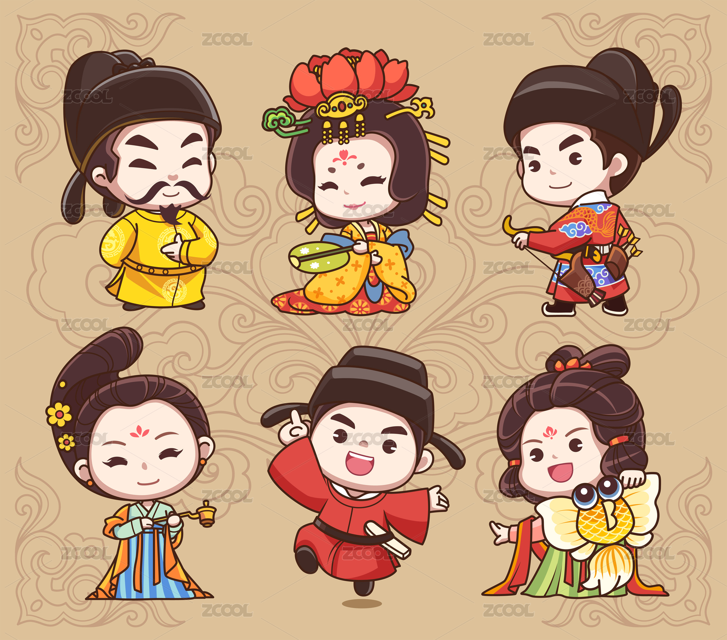 唐朝皇帝與貴妃站立全身像卡通人物插畫