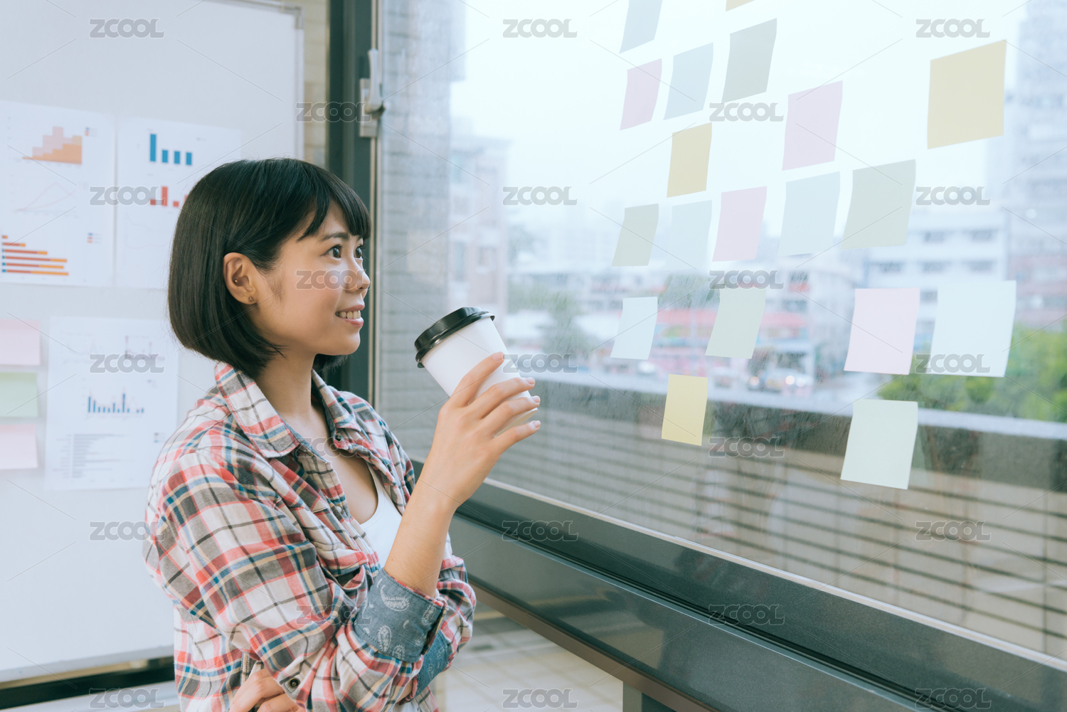 微笑美麗的女人拿著一杯咖啡的玻璃墻看著粘便箋紙和思維案策劃靈感。