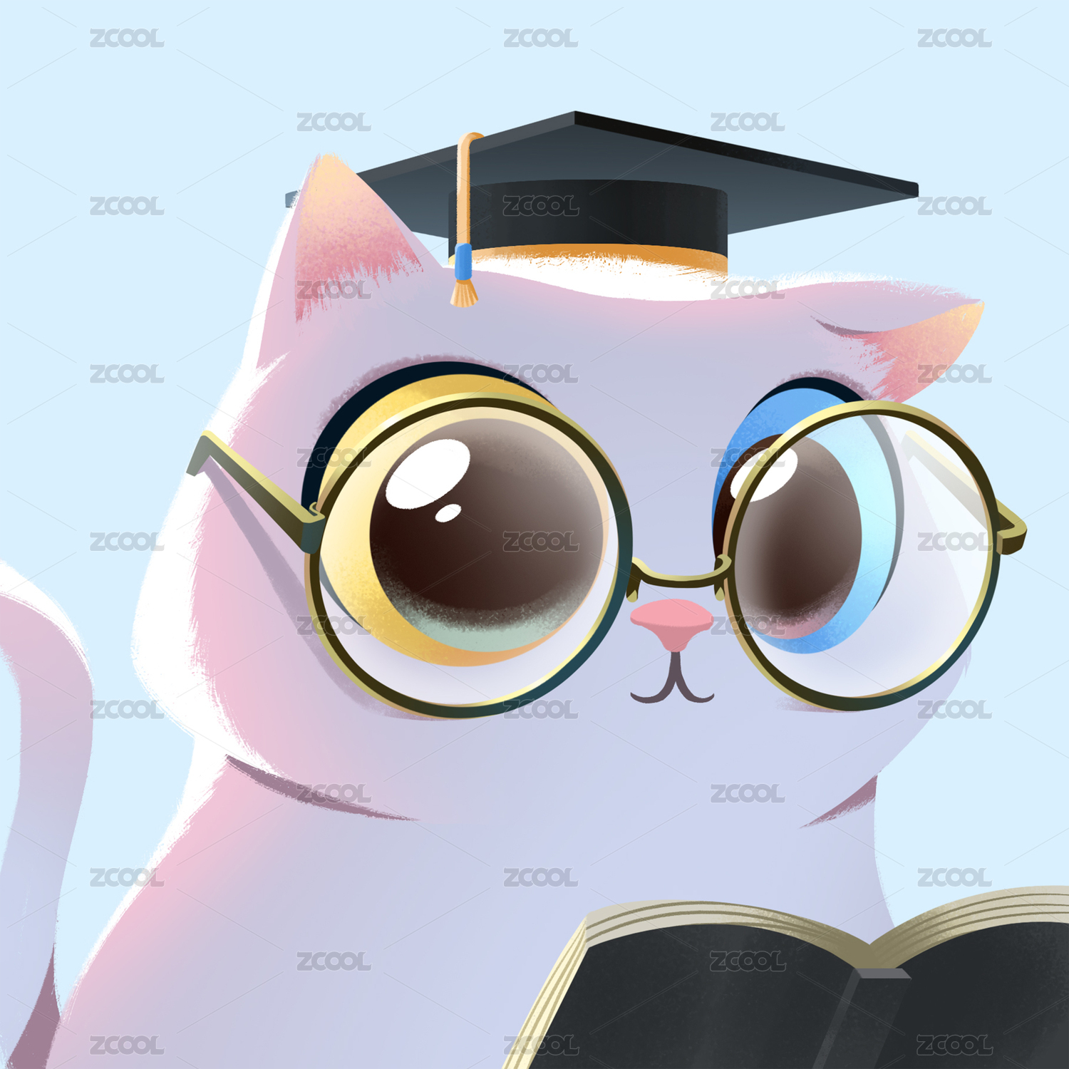 卡通異瞳戴眼鏡博士帽看書的白貓頭像