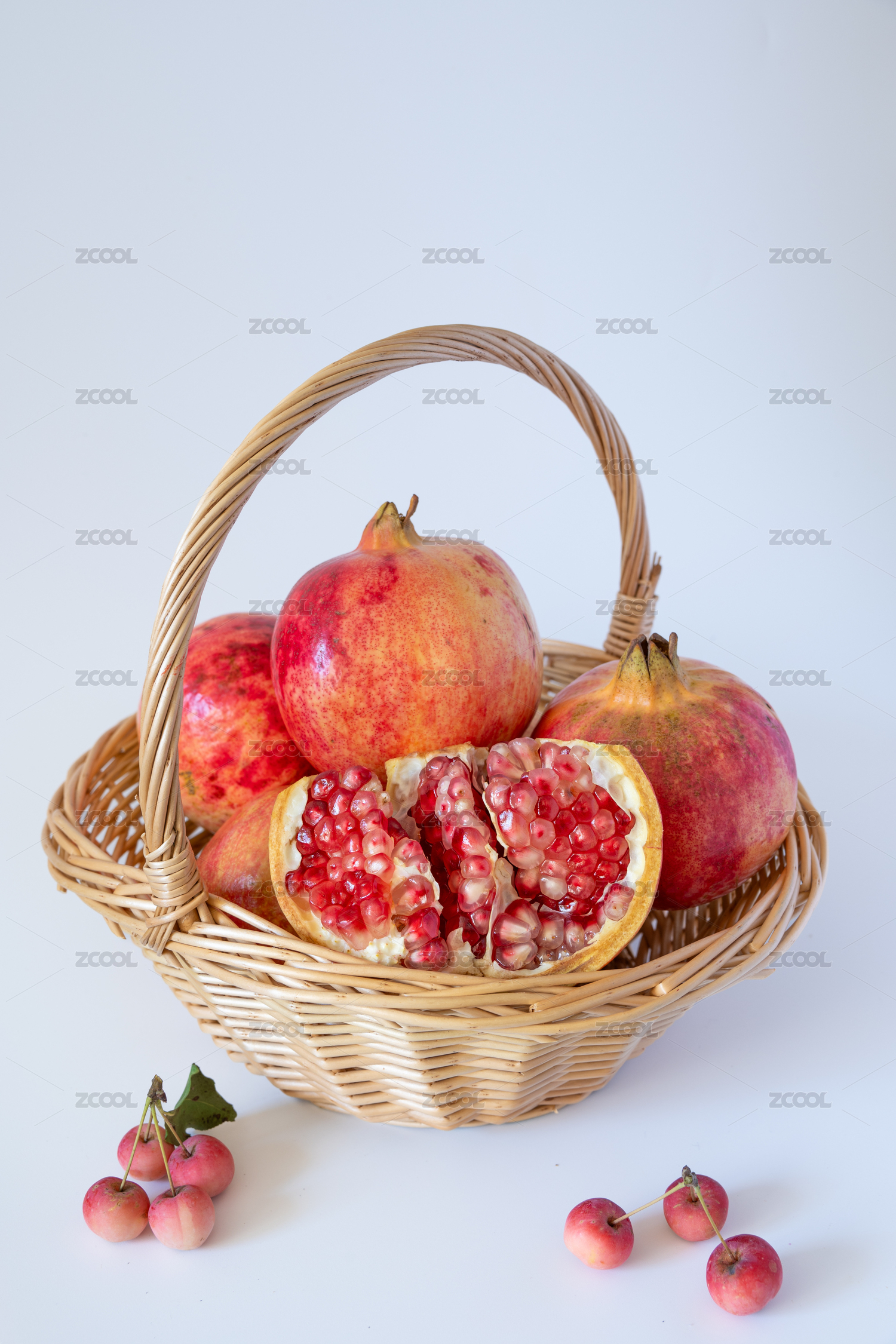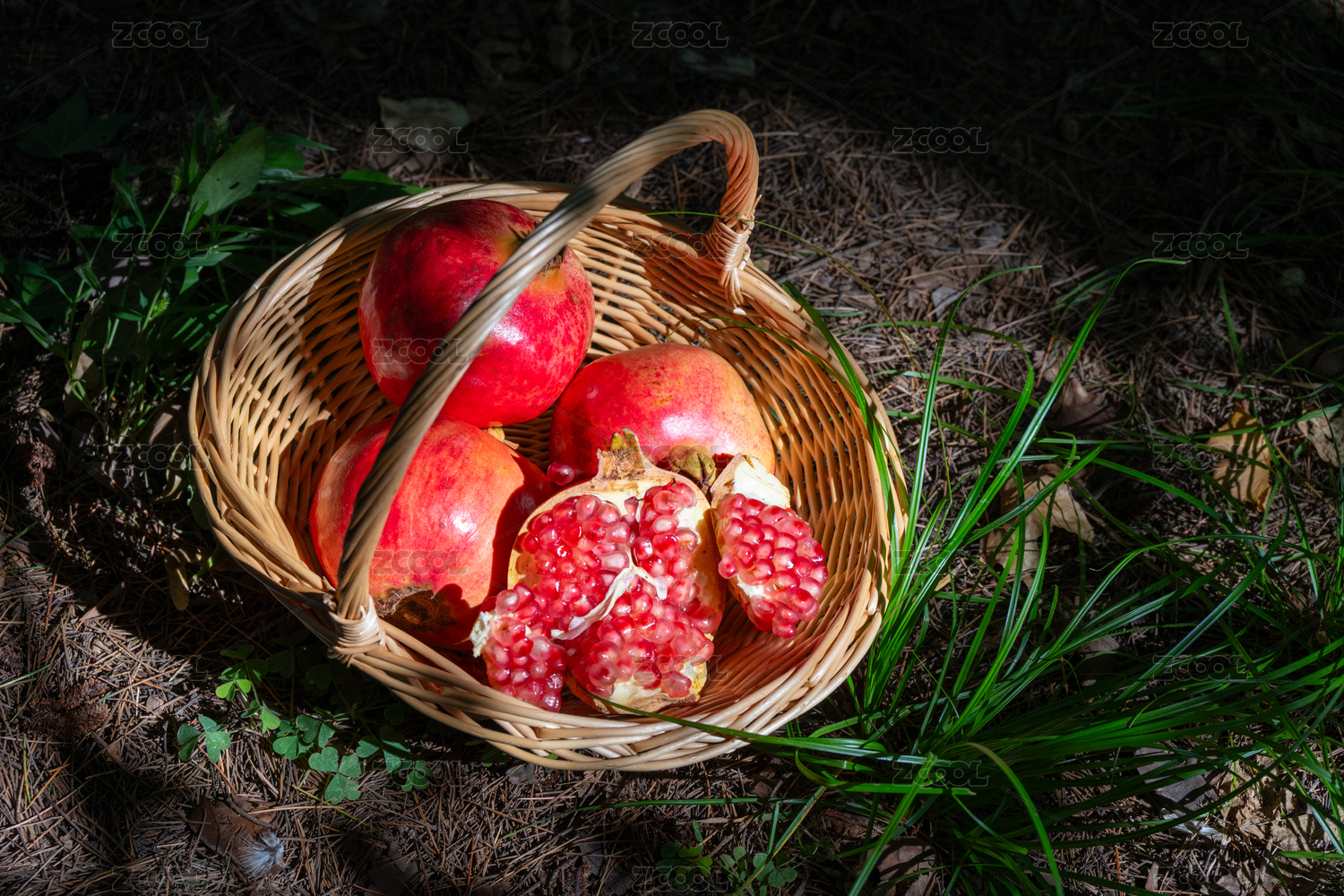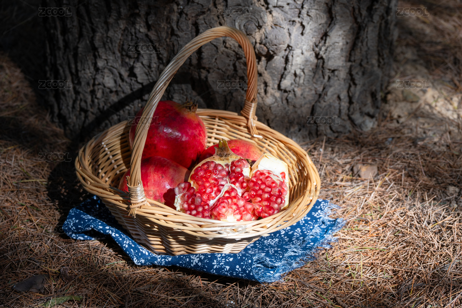松樹旁鋪滿松針落葉的地上剝開的石榴果籃