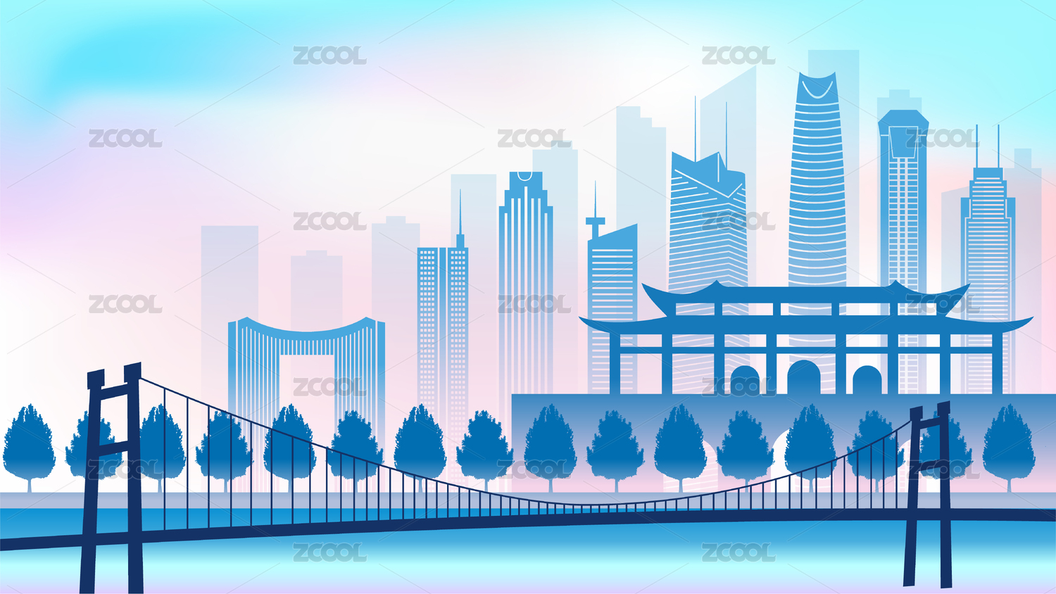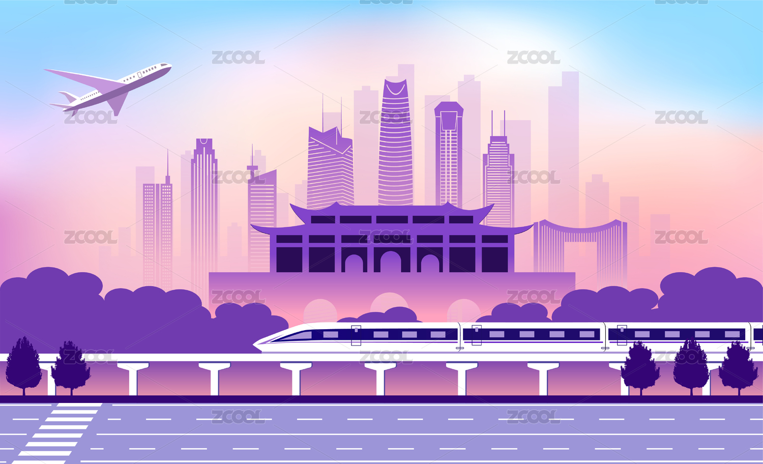 中國廣東東莞市城市旅游交通商務插畫紫色