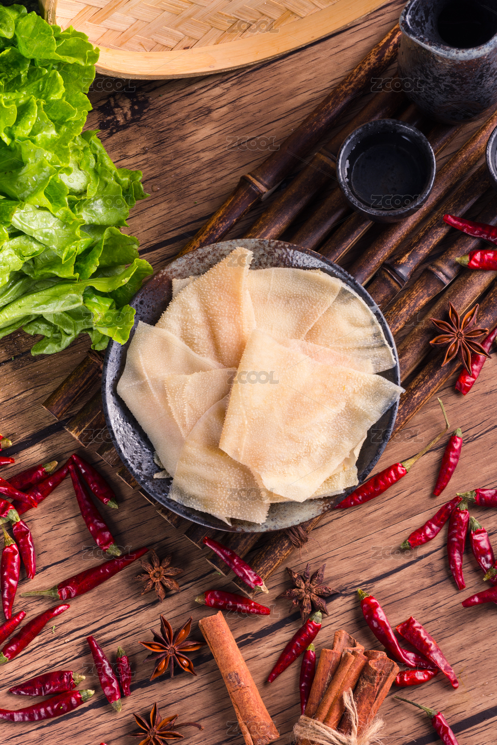 老桌子搪瓷碗里的重慶火鍋菜品白毛肚絲